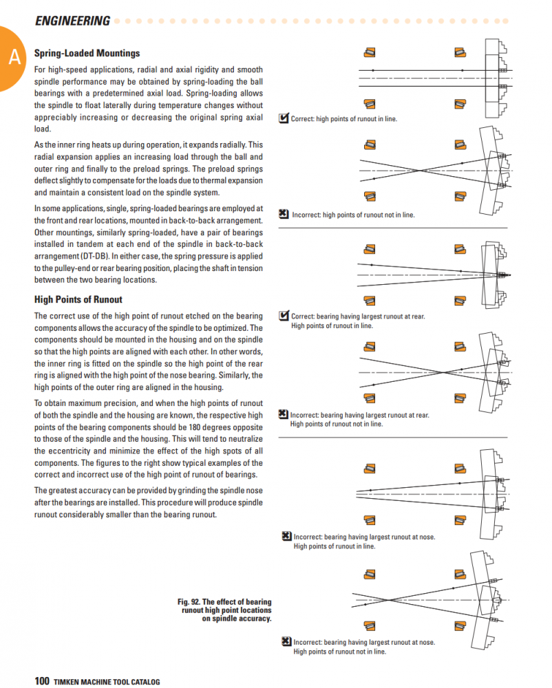 На днях тренировался с разборкой/сборкой передней бабки на старых подшипниках (новые пока берегу). Пробовал метки подшипников ставить диаметрально, затем с одной стороны шпинделя в соответствии с меткой на переднем подшипнике и инструкцией на фото. Разницы в биении не увидел. Т.е. вообще биения не увидел. Ни на носу шпинделя, ни на его задней части... Гайку преднатяга затягивал по инструкции. Может с индикаторной головкой чо? Неверится как-то ))