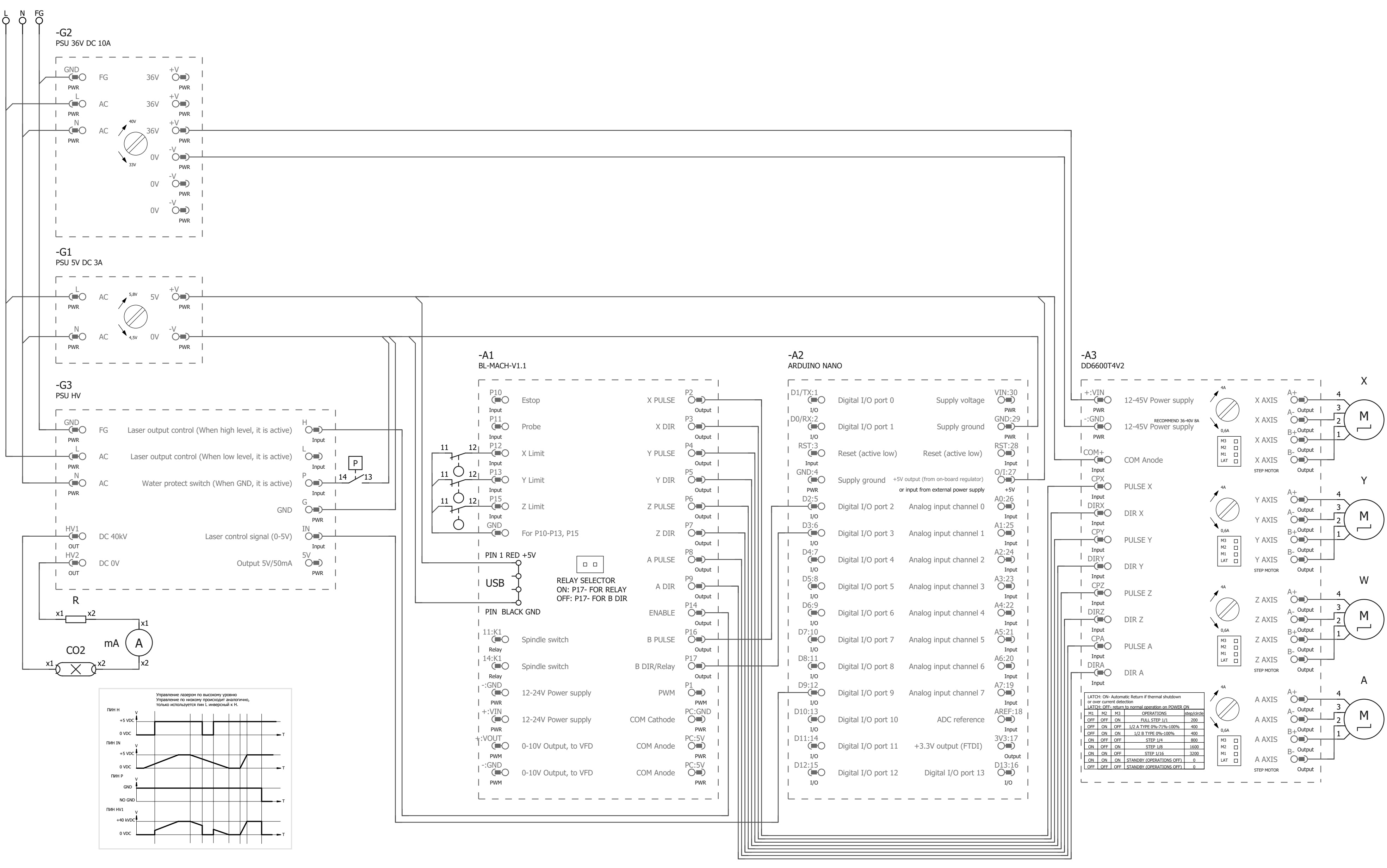 А зачем схема если всё выкидывается?..У драйверов осей там стандартные входы, концевики тоже обычные..Прожиг разве что немного с костылём включается ,если его повесить вместо шпинделя то луч не будет гаснуть между элементами и прожгёт лишние линии. Я двумя оптронами сделал аналог логического И ,на один повесил включение шпинделя и на второй опускание оси Z вниз. Получилось нормально, там где начало реза включается лазер.