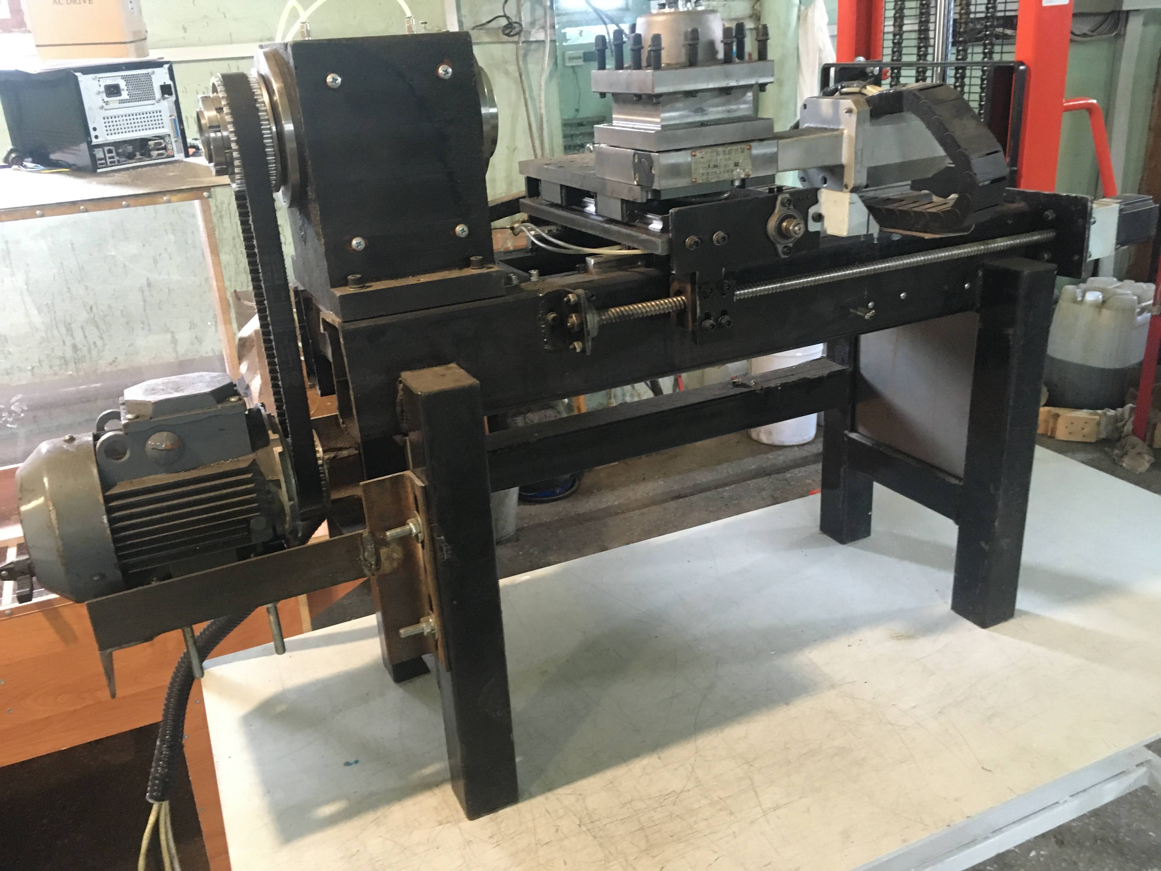 Достался замученный до неживого состояния китайский ЧПУ по дереву. Станина на сварных трубах, рельсовые направляхи, шаговики на 16й ШВП, асинхронник на шпинделе. Приколхожена, но не подключена приводная резцедержка на 4 резца. Шкаф с электроникой почти уничтожен, но даже не очень жалко - в нем лежат останки платы драйверов на 4 оси и плата опторазвязки. Патрон ушел, шпиндельный узел переделан (точнее начата переделка) под гидропатрон, приводные шкивы сделаны под хаасовский зубчатый ремень, стоит асинхронник 0,75 кВт 3000 оборотов.
