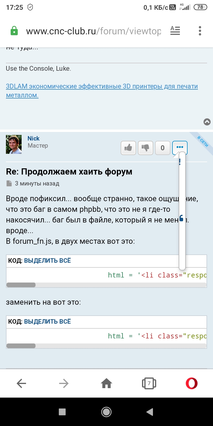 Да, в пятницу уже пытался починить, что-то не зашло с первого раза... Не понимаю, почему меню запихивает не туда...HeavyToshik писал(а): ↑ В мобильной версии имею такой вид меню кнопки с цитатой, редактированием, жалобой. Может там есть ещё пункты, но не видно. Полоска и всё. Браузер хром. Это не хай, это так, обратная связь
