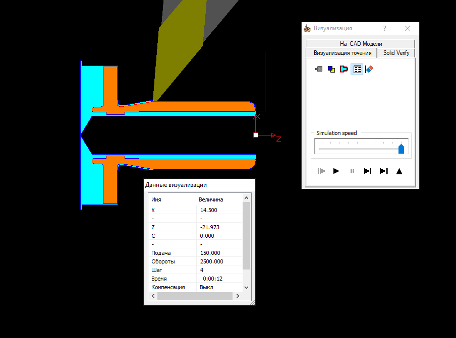 Потом загрузил стандартный пример Turning_1.prz (из C:\Users\Public\Documents\SolidCAM\SolidCAM2019\User\Getting_Started_Examples\SW), ноль то же в центре пов. вращения. На визуализации идет обработка диаметра 33,9мм, координаты по X33,9мм, хотя по логике вещей должно быть X16,95мм. Тут случайно выбираю визуализацию SolidCAM (бета версия), смотрю, что-то новенькое, просто изучаю, а там все как и должно быть обработка диаметра 33,9мм, координаты X16,95мм.