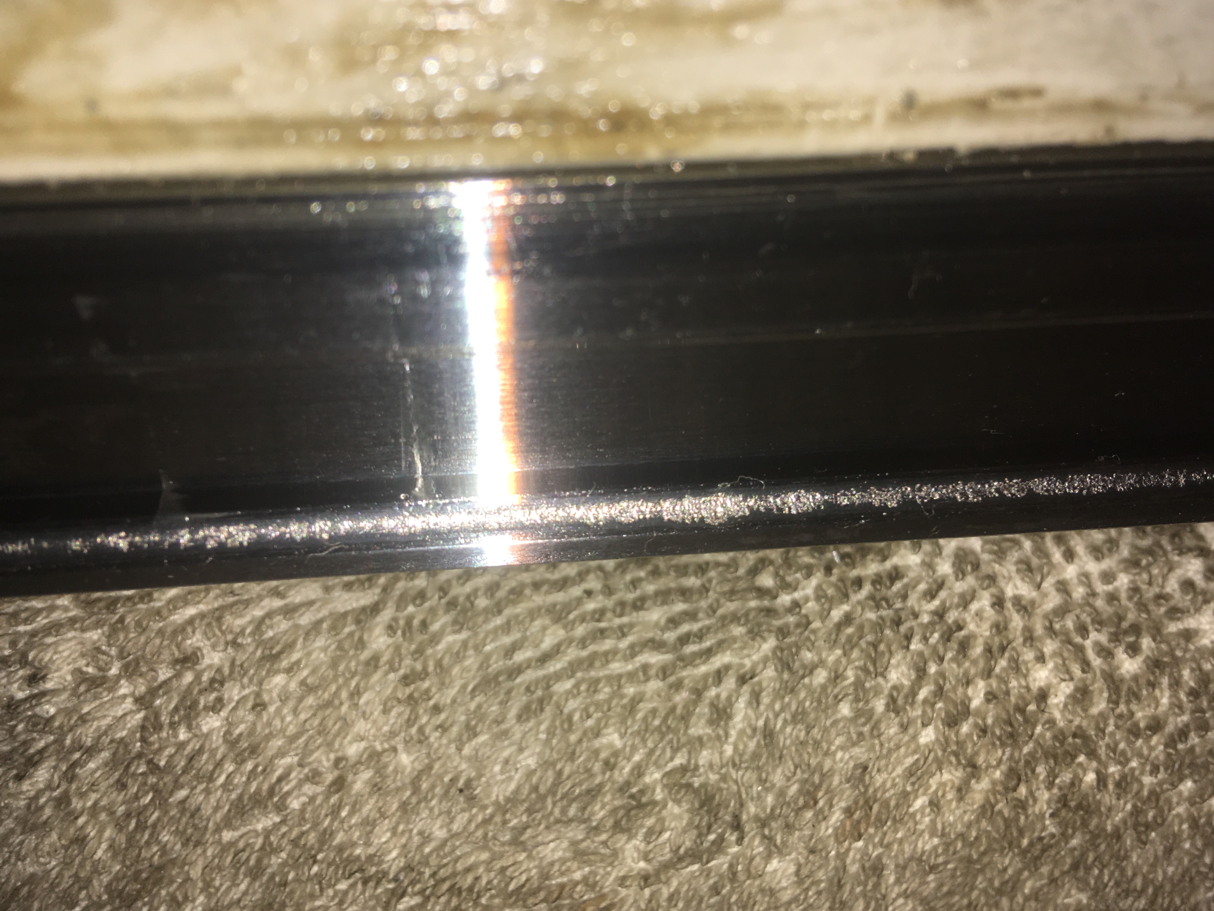 Я бы ее под микроскопом посмотрел. Возможно это электроэрозия пожрала. Если мотор шпинделя или cерва на оси Z пробивала на корпус, то ток шел через рельсу и ее жрало. Чтобы этого избежать, нужно подвижные оси заземлять на станину.