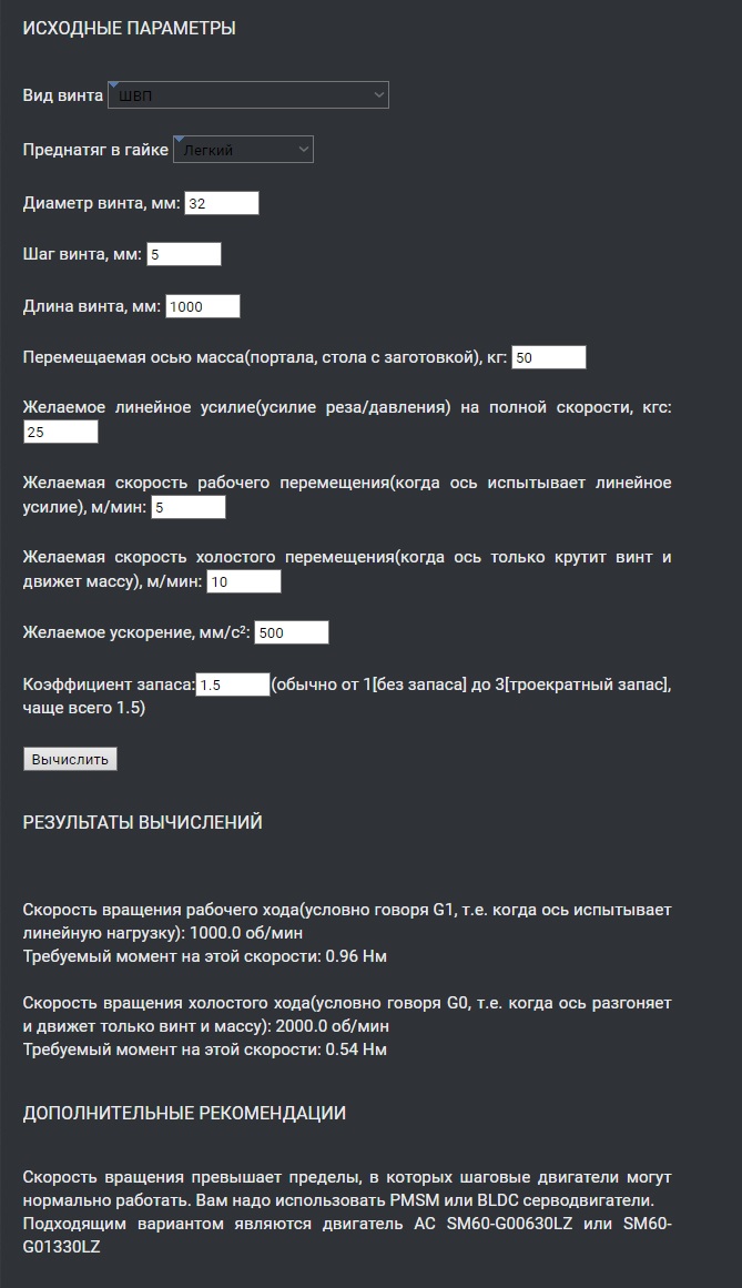 Ввёл параметры швп остальное оставил как было, выдал такие показатели и предлагает сразу сервомоторы один из них 190ватт, значит мои тоже должны подойти.