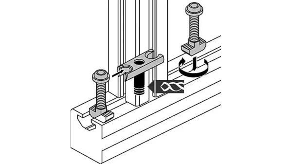 Профиль будет сверлится через спец кондуктор сверлом 17мм, на расстоянии от края 22,5мм, в эти отверстия вставляются болты с пазами под винты, винты же уже в свою очередь, будут вкручиваться в сухари, заложенные в противоположный профиль.