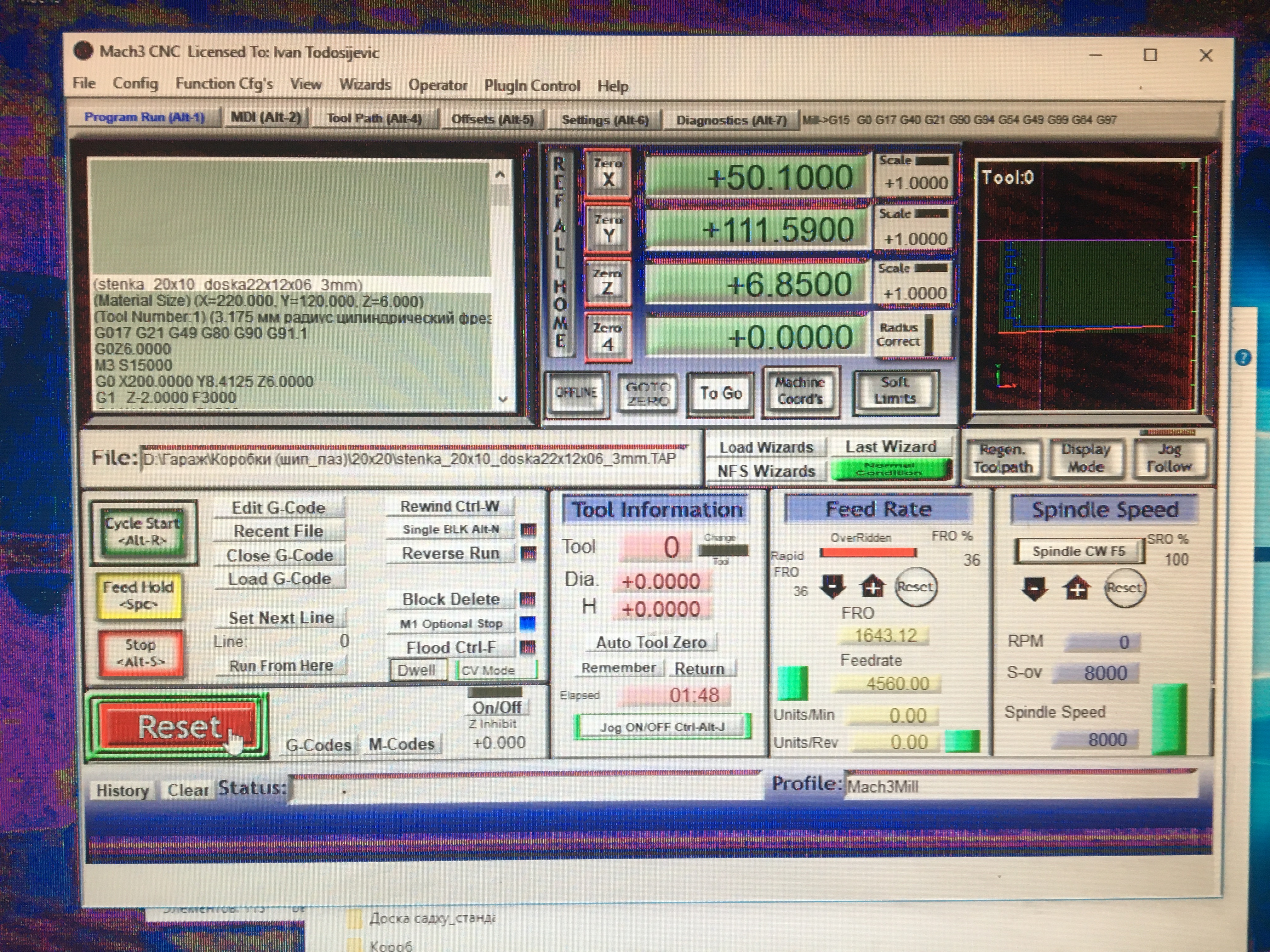 Непонятная проблема. В арткаме создана УП для резки коробки с соединением шип паз. Фреза 3мм. На симуляции всё красиво. Обработка внешняя. Запускаю в мач3. В итоге шип шире паза. На пару миллиметров. Но сама деталь по длине и ширине получается правильной до соток. Подскажите пожалуйста куда копать. Вторая неделя танцев с бубном... Спасибо