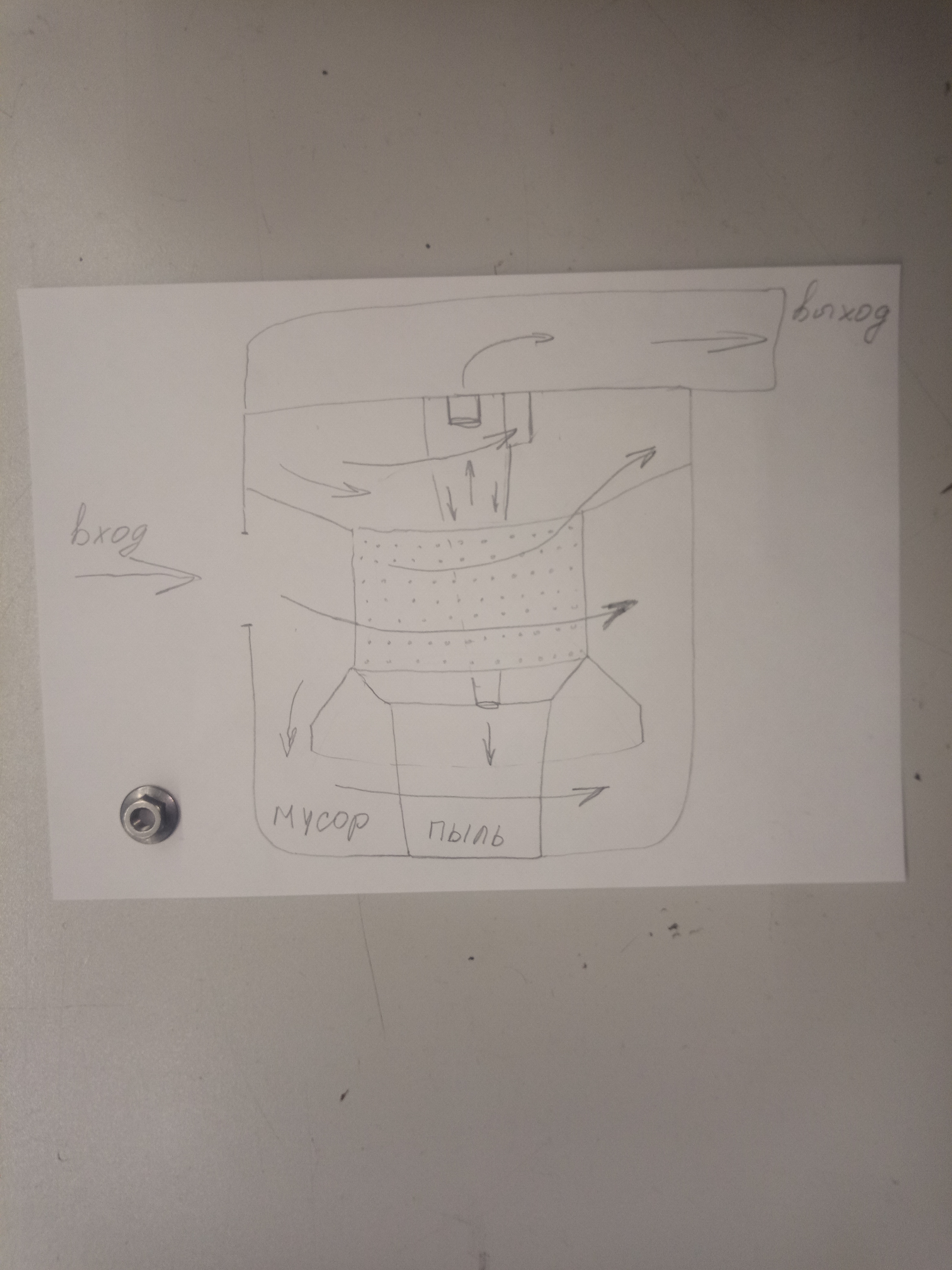 Вот как то так графически. Поток при входе скосами на внешнем кожухе начинает закручиваться против часовой стрелки( если смотреть сверху). Вращаясь крупный мусор уходит по внешней юбке вниз, мелкий через перфорацию уходит во внутренюю камеру, где продолжая вращаться против часовой уходит вверх в расширяющуюся камеру, где поступает во входы мелких циклонов расположеных по кругу всасом ориентированных на встречу потоку. Попав в мелкий циклон дораскручивается я так понимаю ещё быстрее, и мелкая пыль уходит по стенке конуса в нижнюю камеру с закрытым уплотнением дном. Получается две камеры сбора. Крупный мусор и пыль отдельно. Циклонов маленьких 9 штук. Есть ещё по ценру канал непонятного строения. Его просто не видно. Возможно просто трубка создающая разряжение в камере сбора пыли. Сечения у всех одинаковые. Может не понятно, но как смог :thinking: :hehehe: