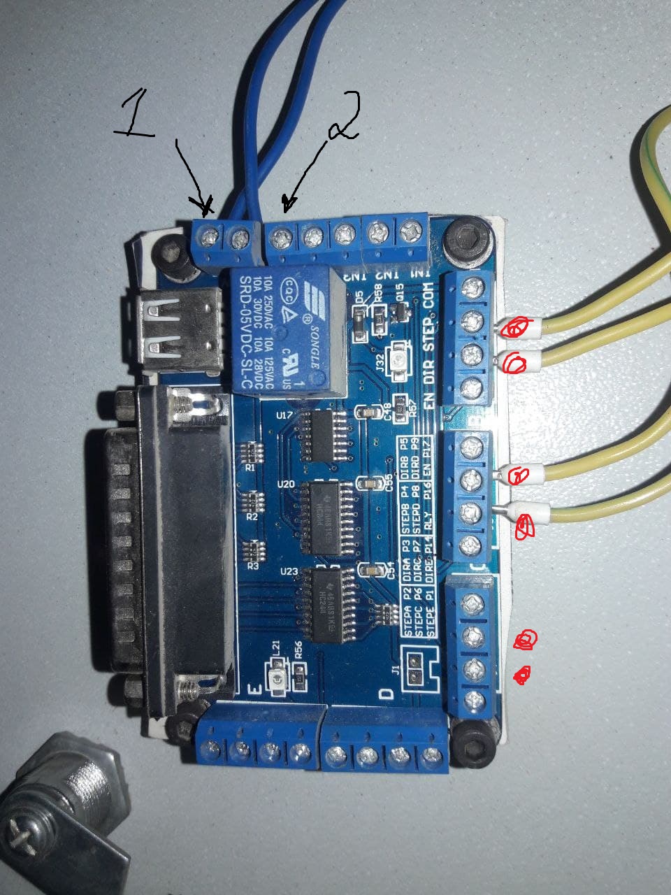 У меня вот такая интерфесная плата, Под номером один это реле шпиндела. 2- это минус всех датчиков. IN1-4 сответсвенно сигнальные кабеля. Красным цветом обозначены драйвера.
