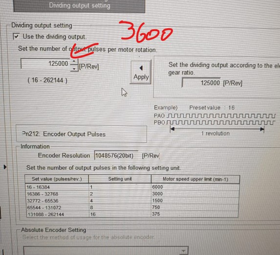 Не знаю, что там визард вам насчитал, но при редукции 1:1 вы получите движение, определяемое кол-вом импульсов энкодера, а у него огромное разрешение (например 2^20). Т.е. ваши 720 импульсов с контроллера подвинут ось на 720 импульсов энкодера (посчитайте какая это часть от 1048576 на оборот). Мануал говорит, что нужно считать в юнитах перемещения, например в величинах 1 мкм. Таким образом, нужно в параметрах Pn20E/Pn210 установить разрешение энкодера/коль-во юнитов (мкм) продвижения оси при полном обороте винта (например 5000 мкм, при шаге винта 5мм). Перечитайре раздел "5.4.4 Electronic Gear".