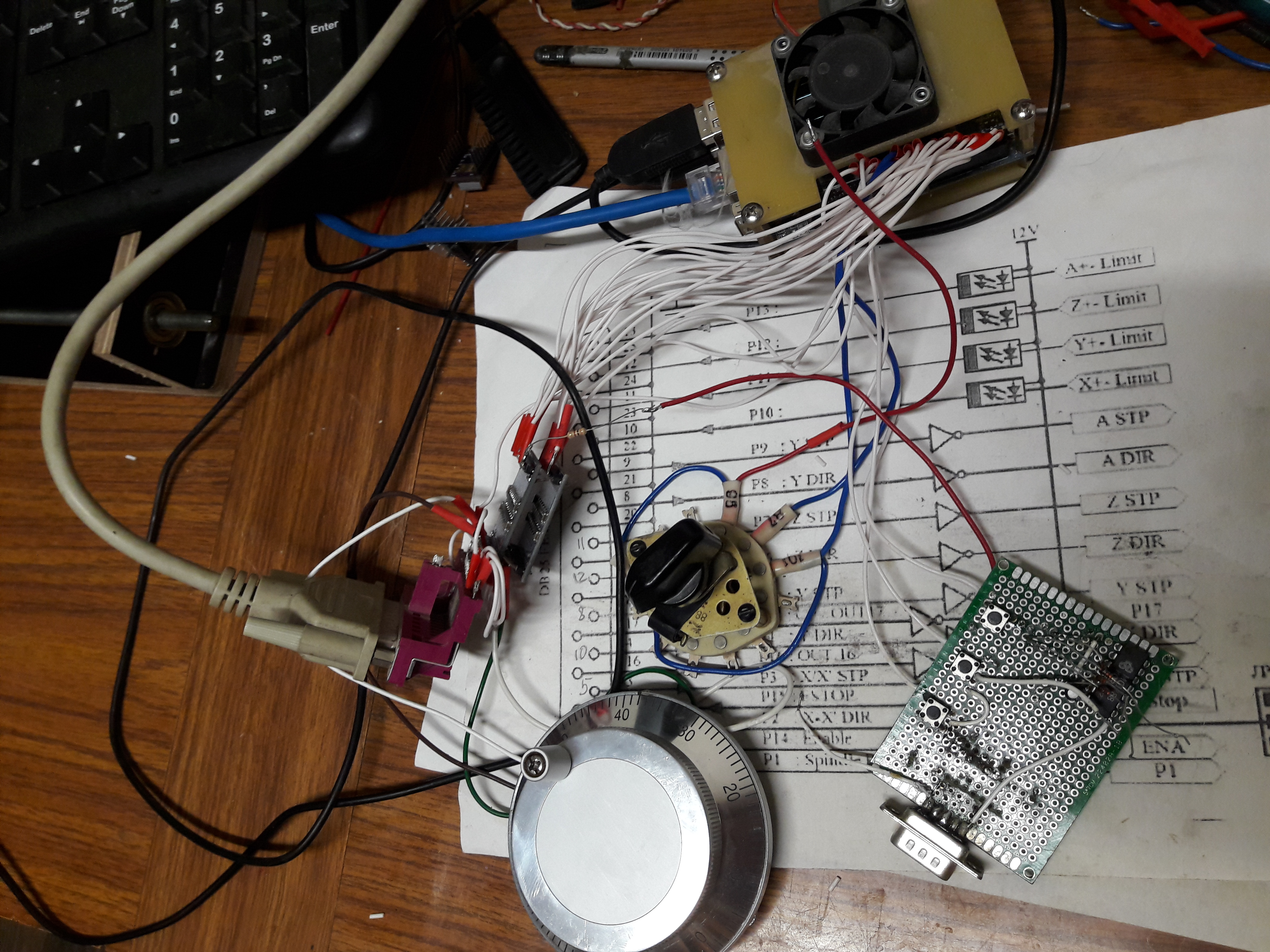 Похоже пора до раскрыть .Всё же прикрутил я это дело без укропа и суперклея! Из "железа" применил два 8ми канальных двунаправленных конвертера 5-3.3 вольта ,спаял их этажеркой за ножки питания .На одном все пошли на драйвера ,на втором три на хоумы ,один енейбл и два на собственно A и B MPG и один ESTOP конечно. Пины выбора осей подключаются кнопками на плюс 3.3 вольта через резистор (был 3К),может и на прямую можно ,но стрёмно. Галетник множителя подключает пины прямо на ноль .Jog Pendant прогнал через конвертер MX_Master и вставил в castom.hal .Вручную поменял входные пины на 24,26,27,28,29,31,32 ,в HALе так же дописал их входами и...... EMC перестал загружаться! Пришлось взять "помощь клуба" и поменять все номера осей (0,1,2) на x,y,z и всё поехало !За исключением одного ,на 24й ноге есть потенциал 3.3 вольта и при замыкании на ноль шкала переключается ,а на 26й (пробовал и 23ю и 37ю ) ноль и не переключается соответственно ,если подать туда 3.3 вольта через резистор то движения нет вообще .С этим я готов мириться ,что бы не нарваться на рифму :cheesy: . Короче тем что получилось я очень доволен !Автору благодарен за разработку ! Весьма не плохая штуковина вышла ! По расходам наверное всё (апельсин,блок питания,конвертеры,кулер,флэшка) в три тыр помещается .Сваяю корпус для пульта и буду пробовать на "большом " станке .Есть 20ти и 40мм стеклотекстолит ,можно выстругать из него ,но вреднючей пыли будет ....За то монолит !Или сборный из тонкого ,подумаю .