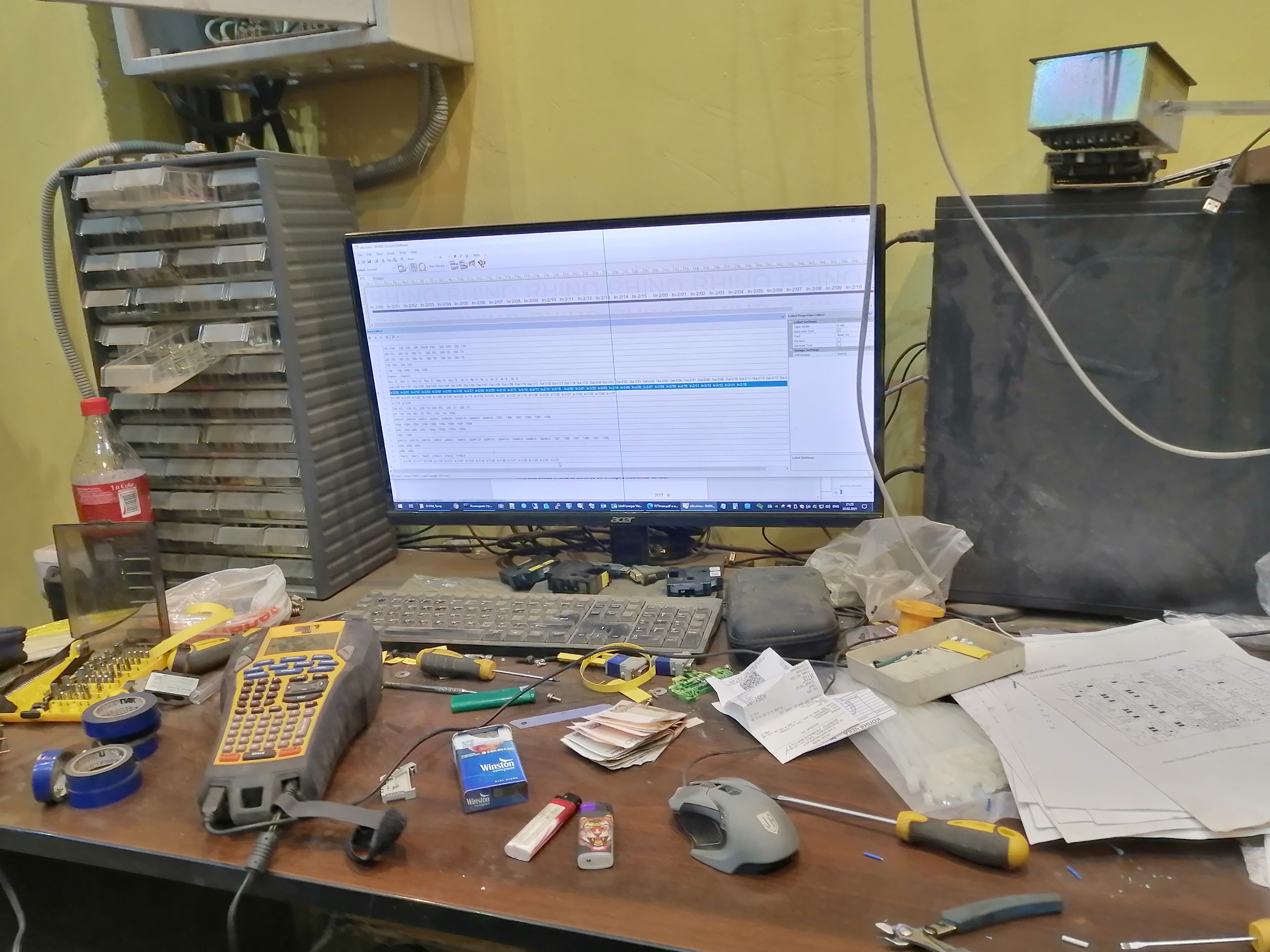 Маленький хаос на рабочем столе, на экране открыт софт от принтера для печати термоусадок с маркировкой.