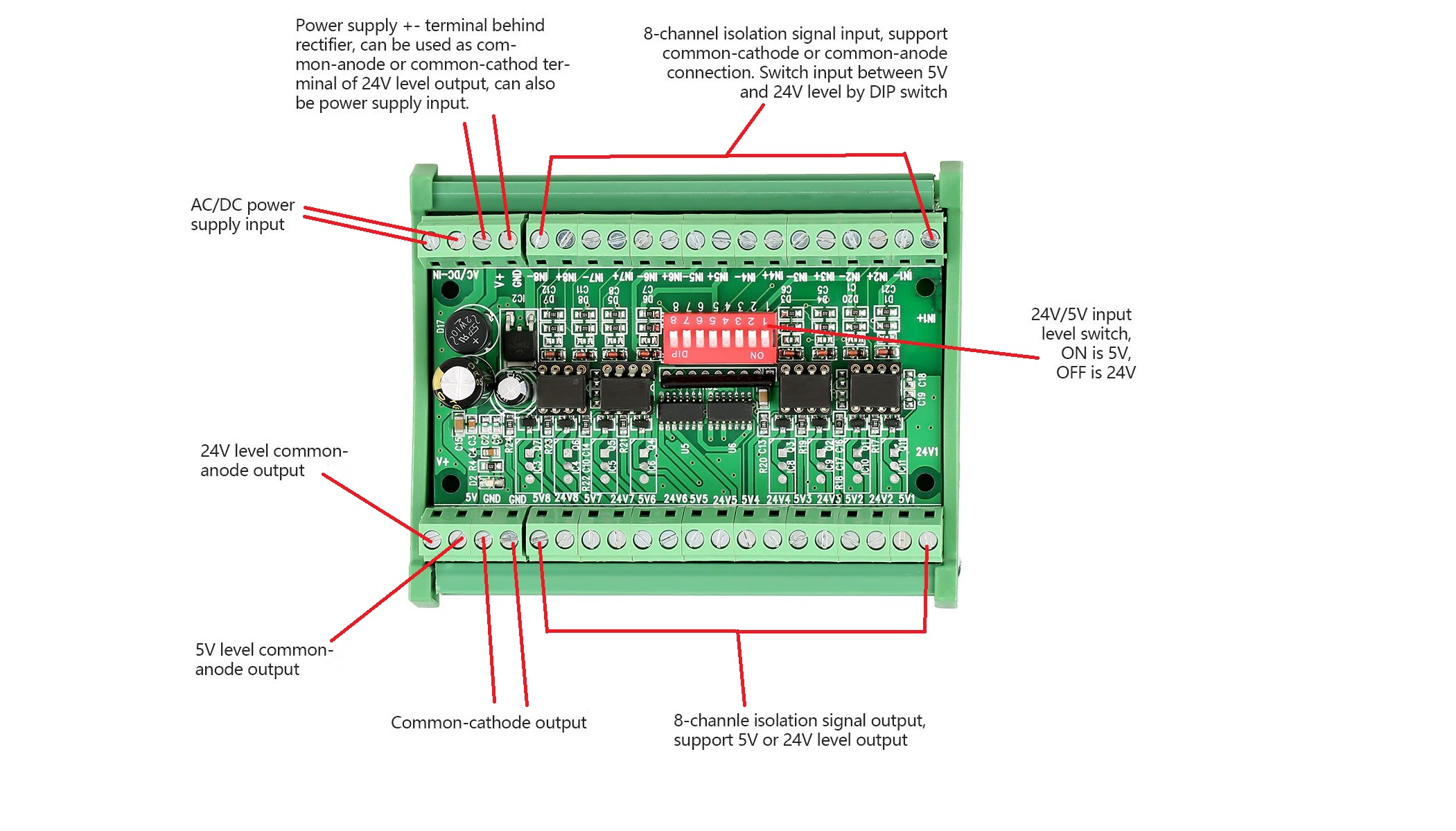 Насчёт катод/анод это общие выходные + и -, уже точно не помню, но на них есть напряжение соответственно маркировке 24в и 5в, т.е. плата пропускает через себя напряжение и на выходе первых клемм получаем 24в и 5в.