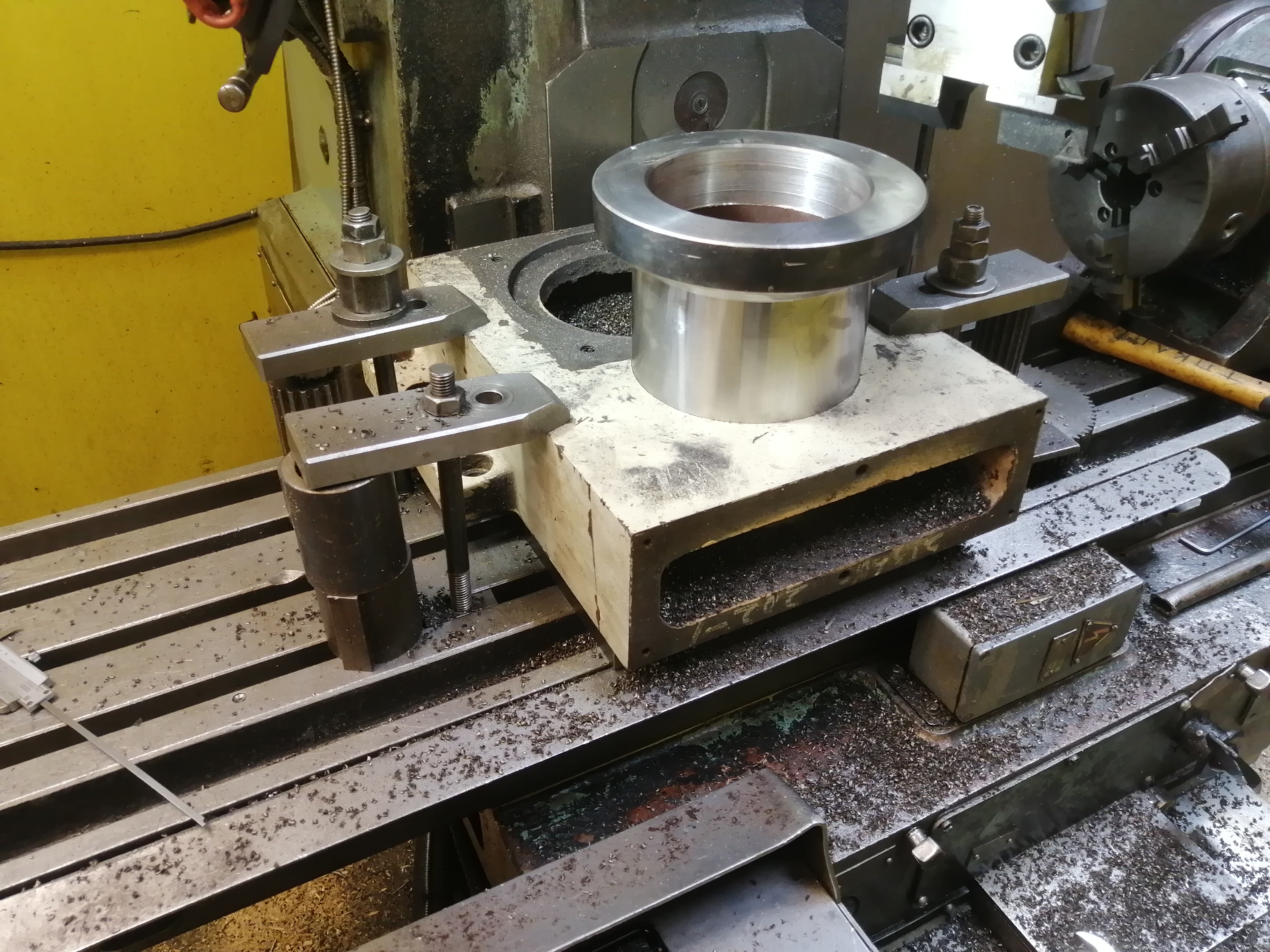 Сегодня наконец-то мне дали попользоваться фрезером. Взял расточные головки, чугуняку от "Тошибы" весом в 70кг и поехал грызть металл.