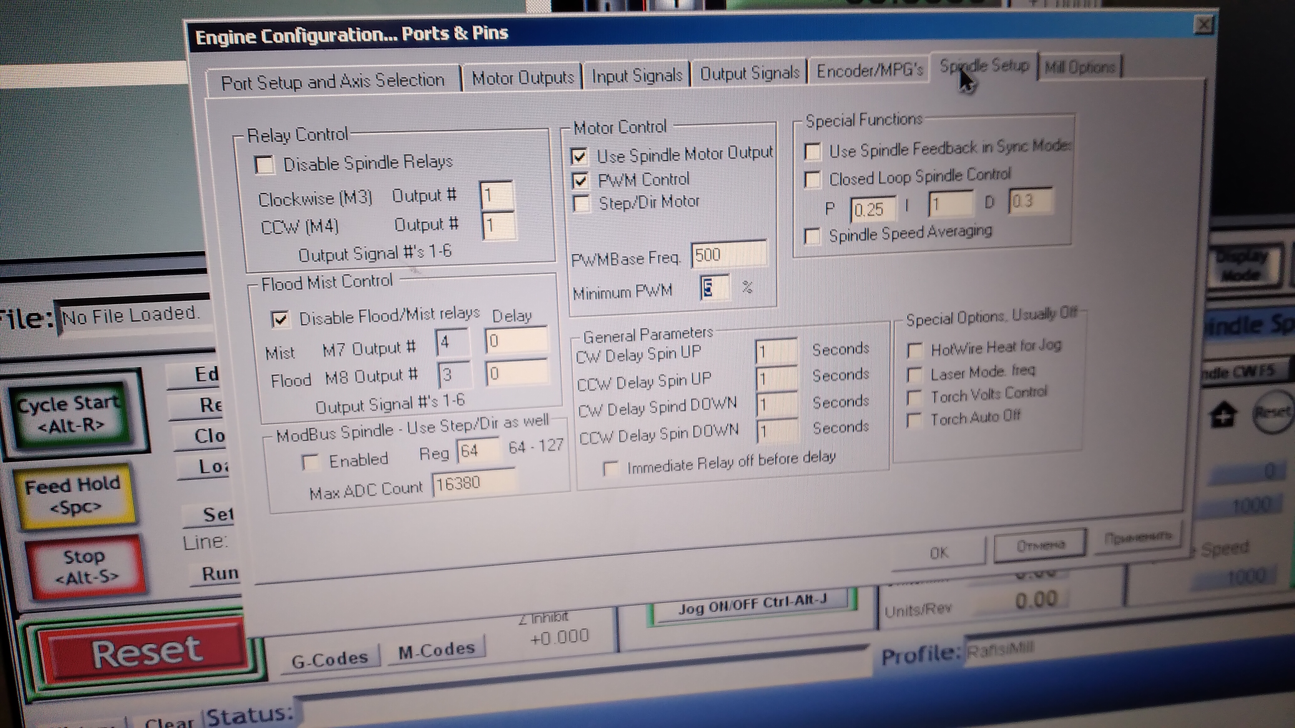 В общем потыркал настройки матча,всё заработало,регулеровка оборотов работает,но не сходится с реальными оборотами и обороты постоянно скачут,отключается шпиндель при движении назад по оси X.