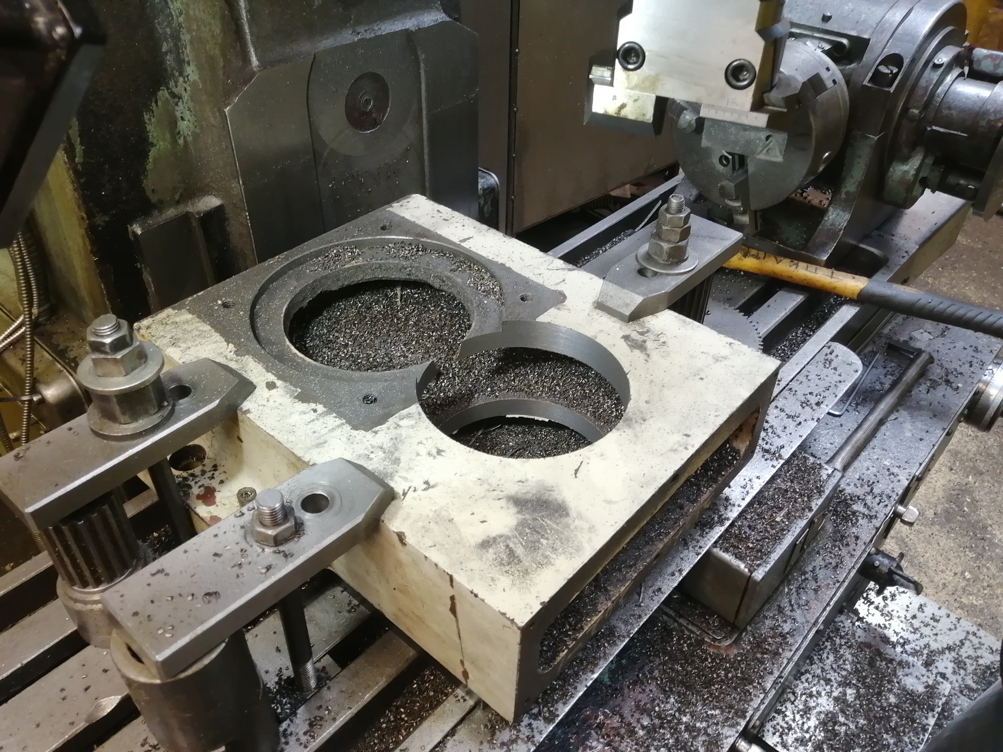 Сегодня наконец-то мне дали попользоваться фрезером. Взял расточные головки, чугуняку от "Тошибы" весом в 70кг и поехал грызть металл.