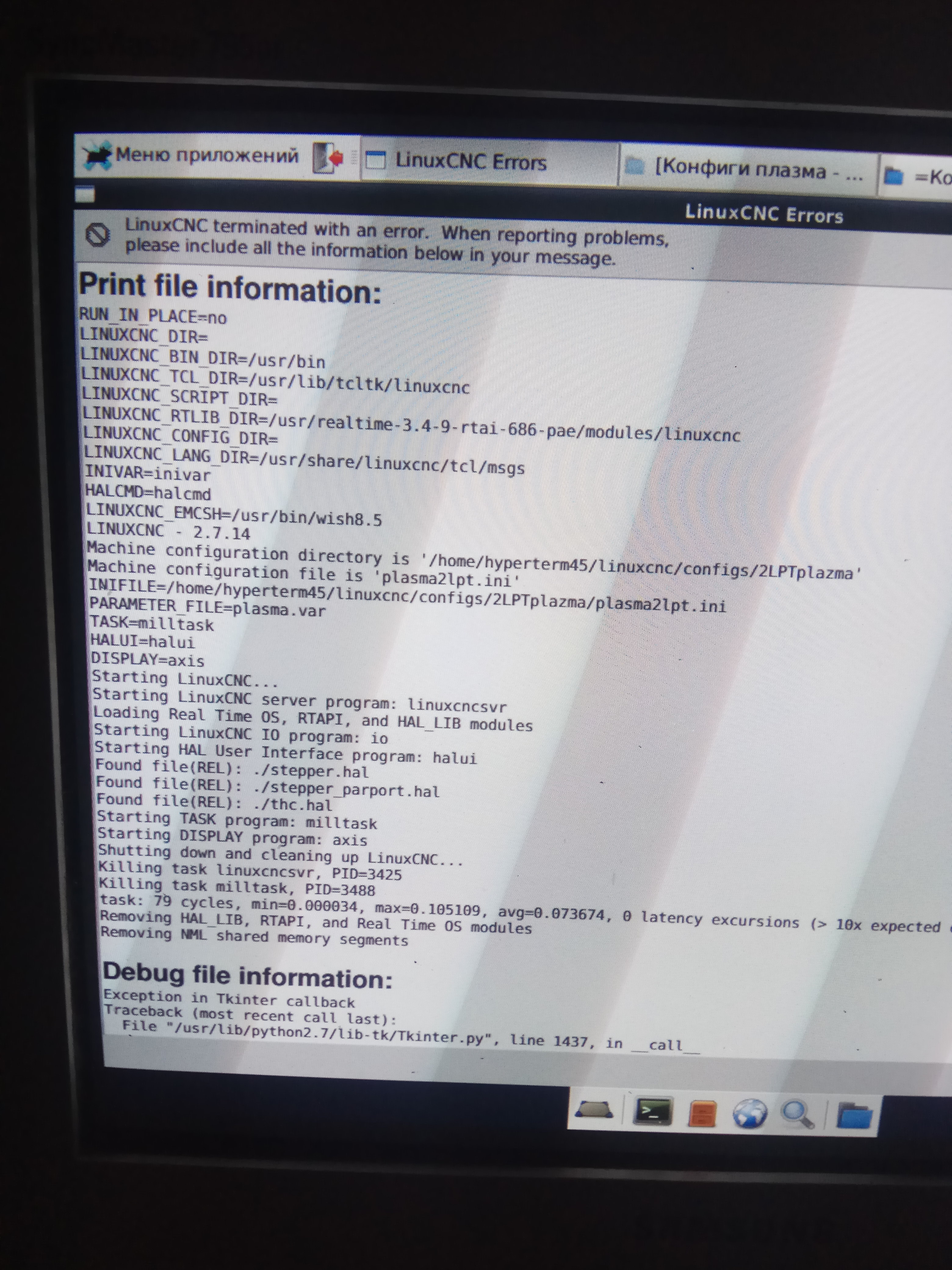 Уважаемые приветствую! Пожалуйста помогите, кто может, с установкой данного девайса. При подаче питания на станок (отжимаю кнопку) на мониторе, сразу выпадают три ошибки. Вроде все уже перелопатил, где нужно подправить, разобраться не могу. Компьютер пока к станку не подключен, дома плата опторазвязки LPT, драйвер и шаговый мотор. Этот комплект работает с конфигурациями из stepconf wizard, а с данным конфигом как то не получается.