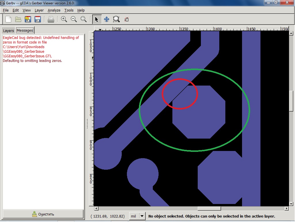 При загрузке Гербера словил некий глюк. Прилагаю сам гербер и картинку части платы с ошибкой. Помогите разобраться.