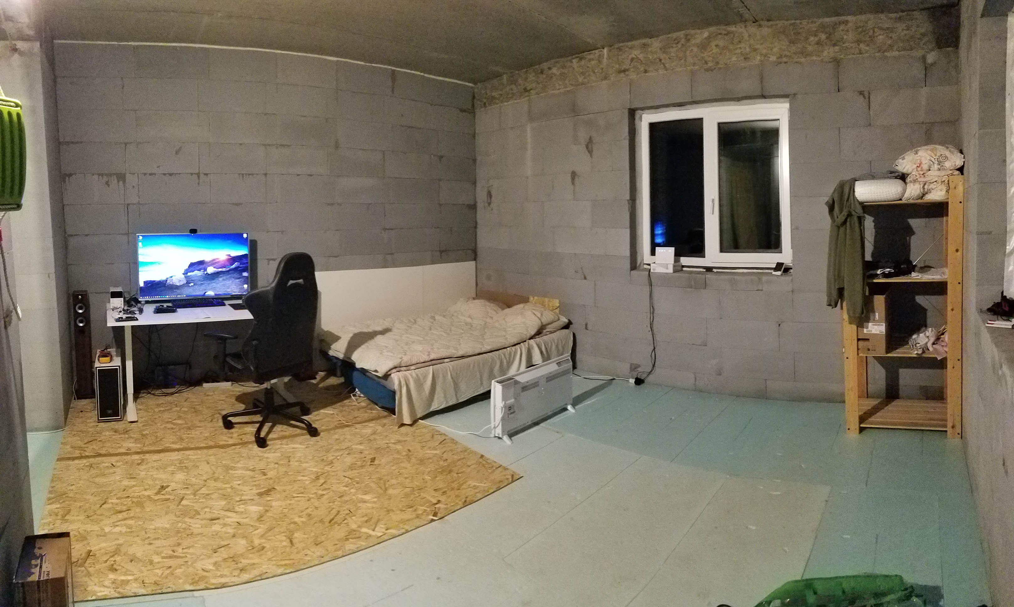 Электричества пока нет. Закрыл пенопластом проем на второй этаж. Притащил печку из сарайки. Стало намного веселее