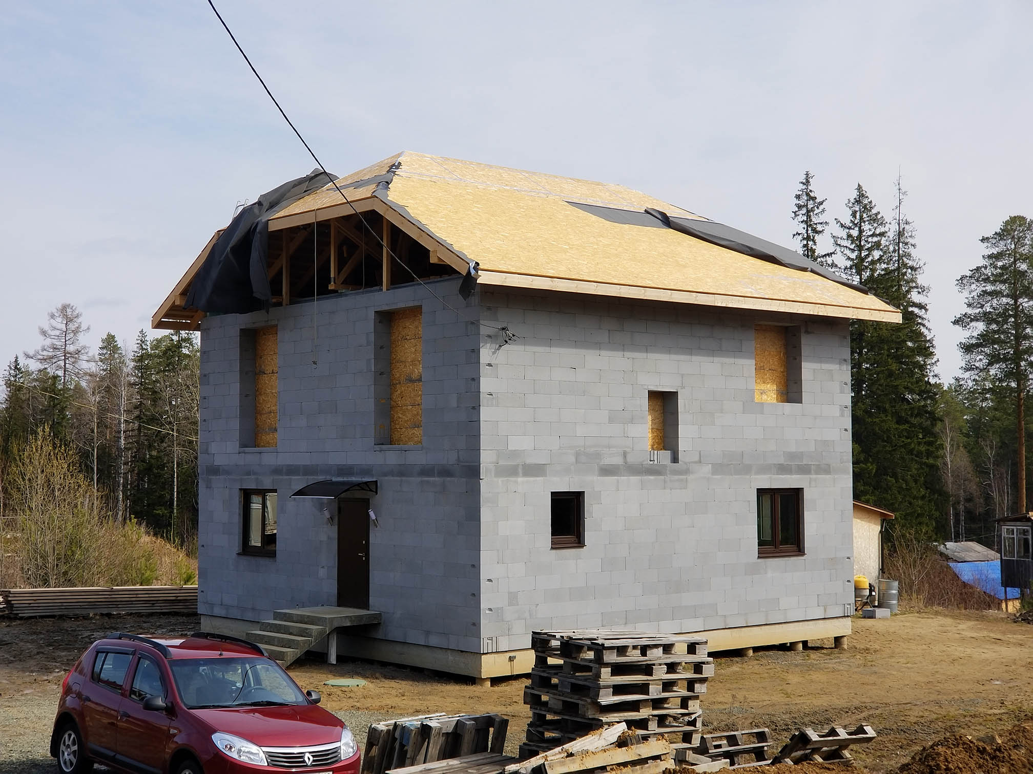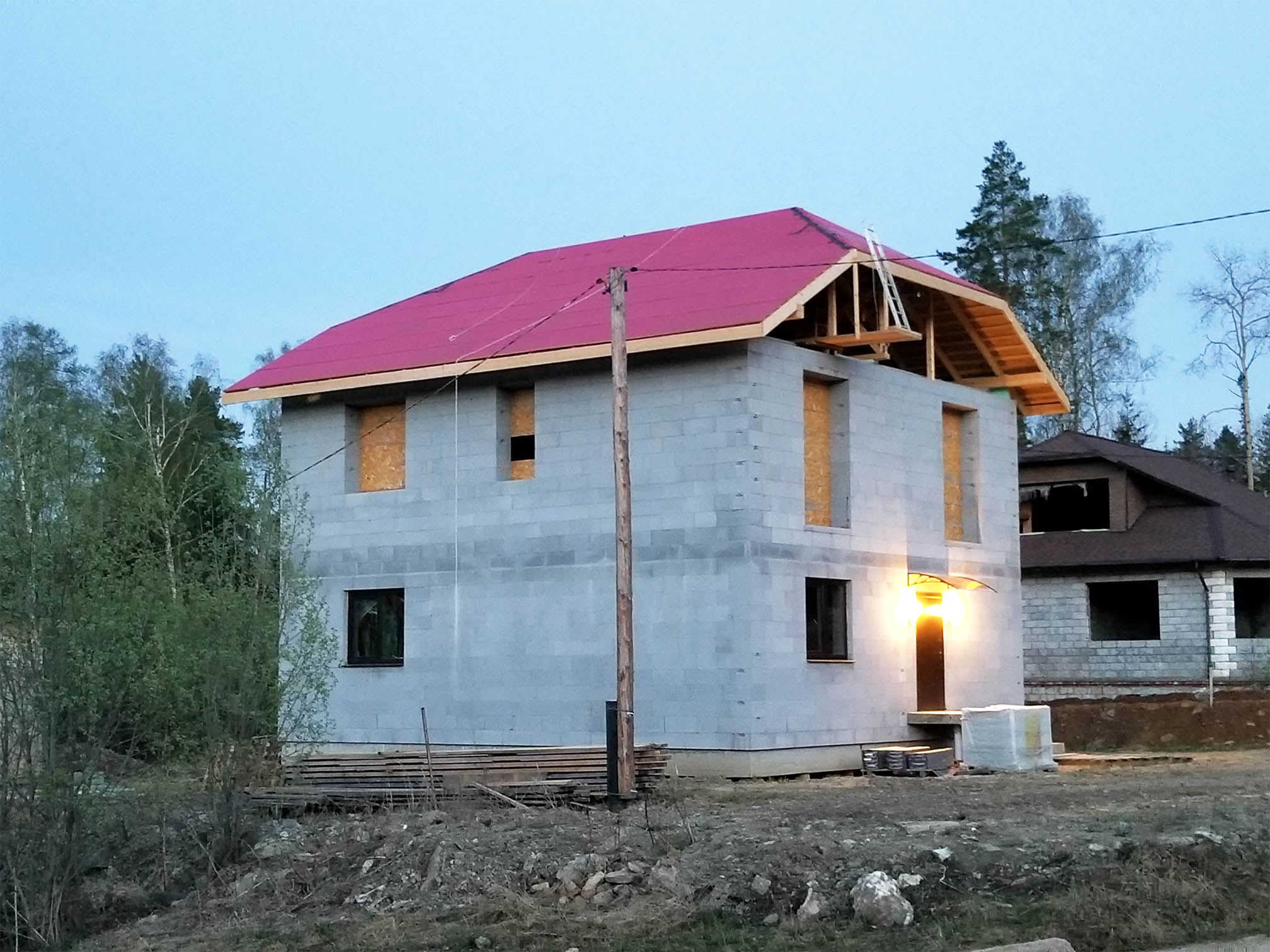Казалось бы, все самое сложное позади. Осталась отделка и мелочевка. Но нет, самое сложное только начиналось. Сил уже не было (из за спешки сделать крышу до весенних дождей). Денег — тоже. Да, собственно, и купить ничего не удавалось. Везде кормили обещаниями — вы подождите 2 недели, карантин отменят, вирус исчезнет, и мы возобновим работу... Даже город пытались полностью закрыть на какое-то время. Но не смогли. Втихаря съездил в Екатеринбург, купил (из под полы) подкладочный ковер для гибкой черепицы: