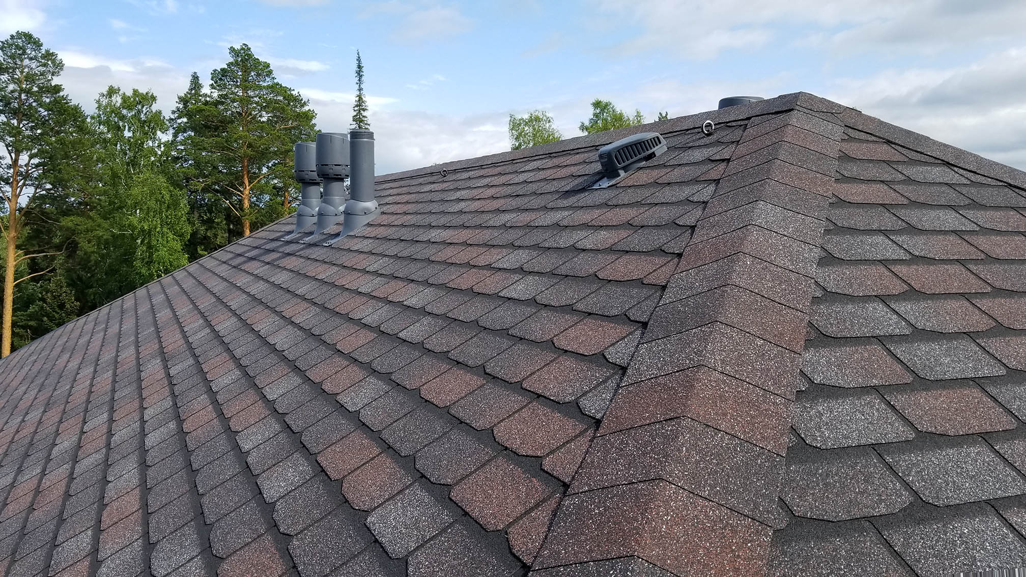 Раскатать первый рулон было очень сложно. И из за того, что оно норовил скрутиться в трубочку и соскользунть вниз. И из за того, что его нужно было одновременно и раскатывать и закреплять одновременно и мастикой и гвоздями. И страховка у меня была плохая (веревки растягивались, а когда ты находишься на углу крыши — страховка тебя не спасет, т.к. закреплена она ближе к центру на коньке).