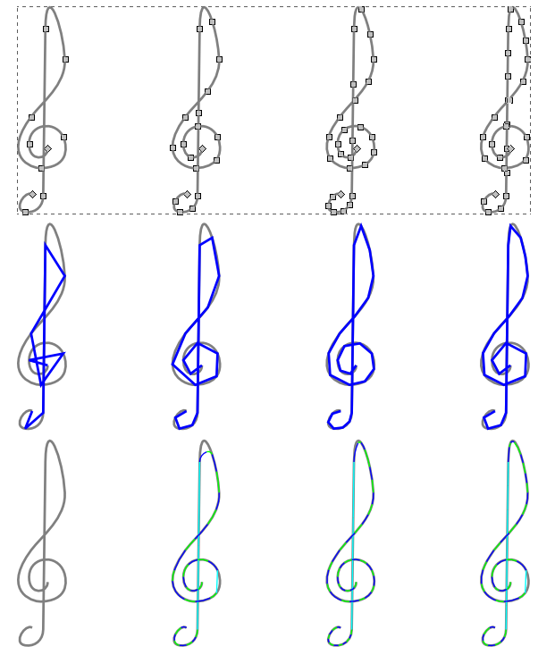 • при нулевой длине одной из касательных алгоритм не работает. Вопрос, как это пофиксить, хотя, возможно, при этих условиях кривая точно аппроксимируется одной дугой. Нужно это проверить.