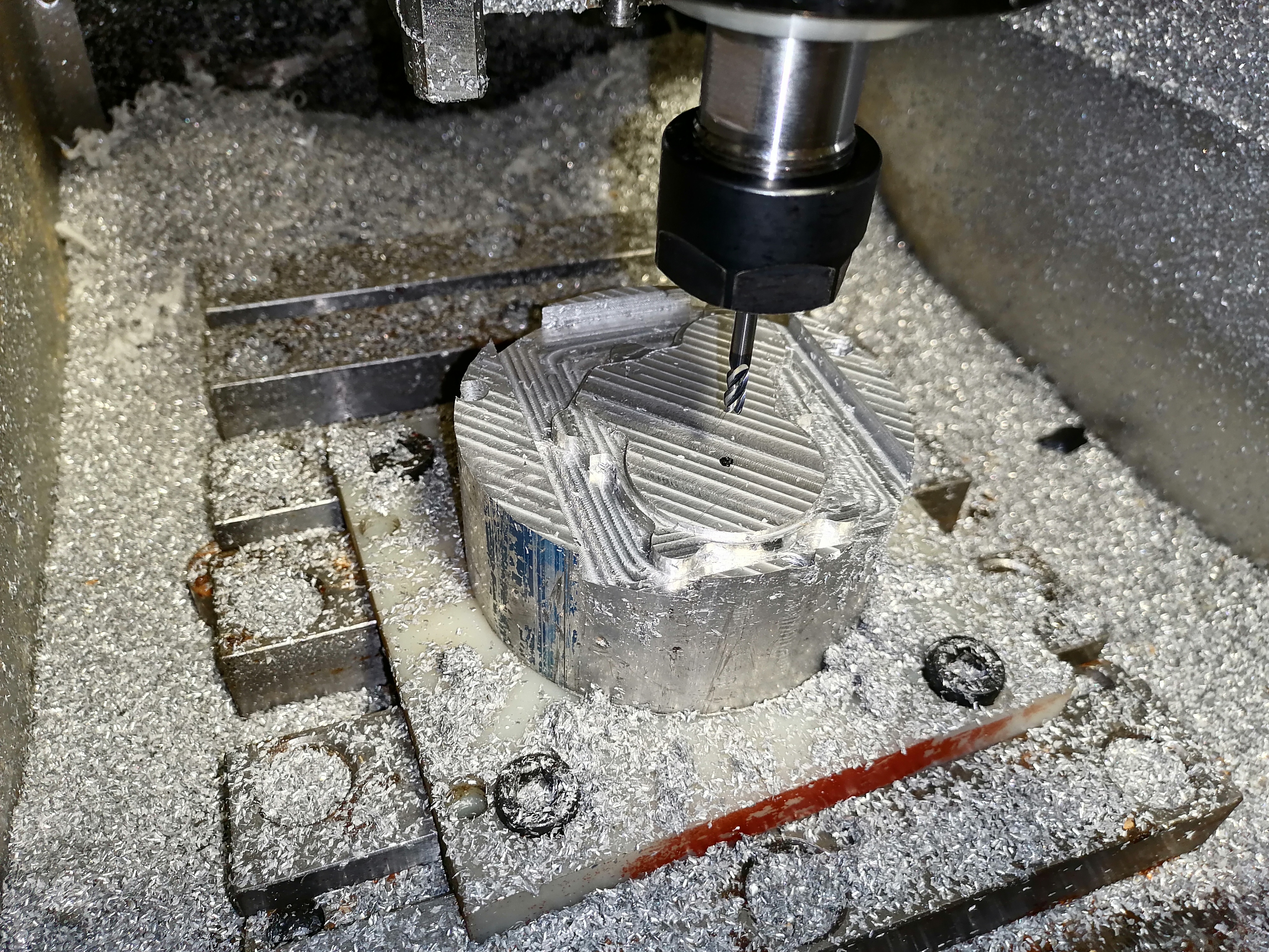 Давно не подходил к станку а тут мне отец подогнал два кругляша болванки как раз в размер детальки :) ну думаю в эти выходные попробую поработать на станке ну не тут то было. Сразу при обдирке фрезой диаметром 10 мм не понравился звук, поменял на шестерку и на пол пути фреза забилась, почистил и продолжил дальше обдирать, дальше взял специально купленную для этого длинную фрезу диаметром 4 мм. и тут понеслось - каждые 2 минуты останавливал станок и чистил фрезу а потом вообще она сломалась оставив последнюю свою борозду (работал с сожем). Вобщем веню во всем материал алюминия который я пытался погрызть :) надо будет гуглить, разбираться что за марка алюминия и какие режимы для него нужны будут.