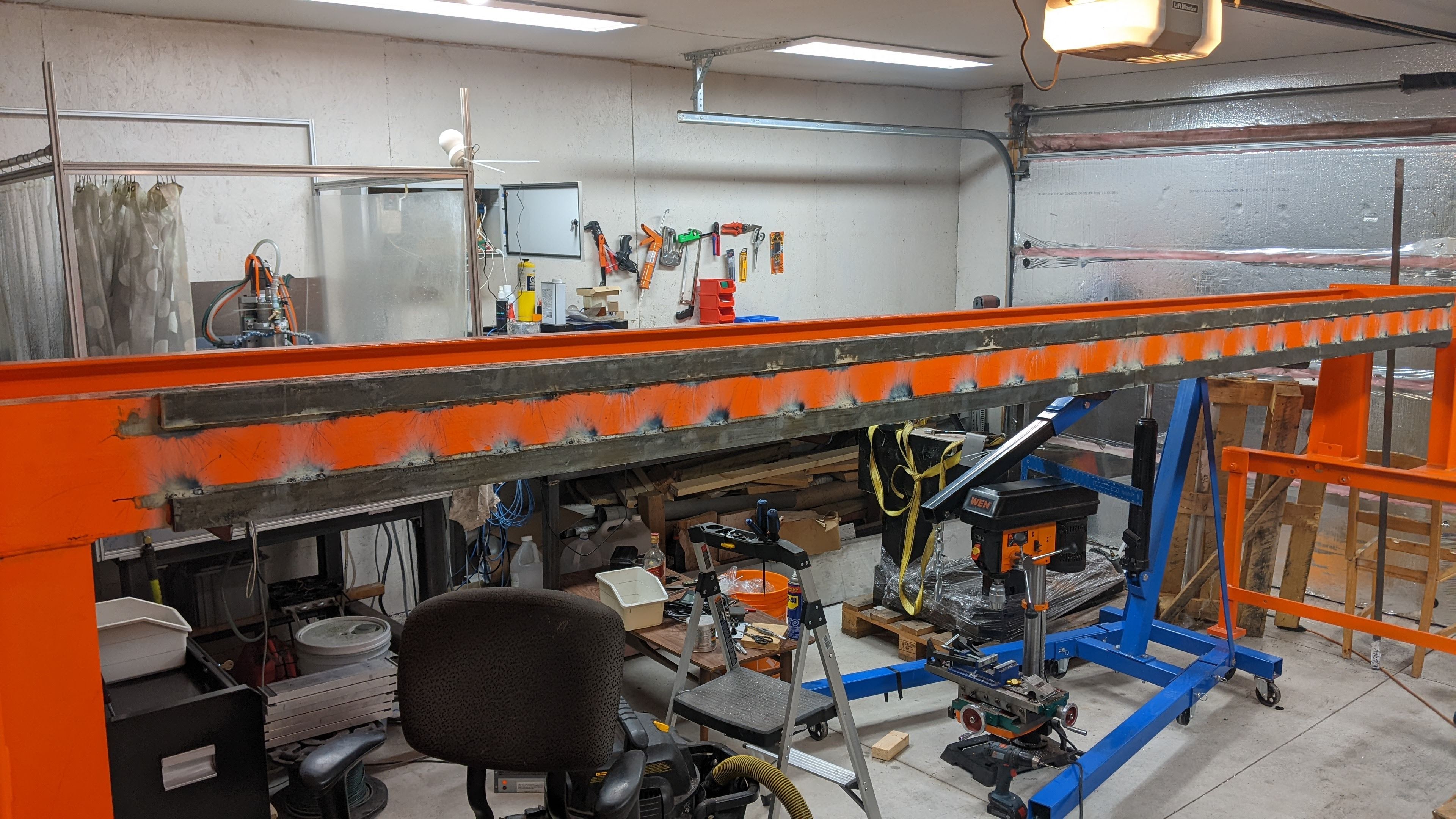 Приехал мост в одно зимнее утро: Так как к мосту были прекрепленны колеса то не составило труда закатить в гараж: Приступаем к навариванию проставок под рельсы: Ну и параллельно собираем шкаф управления:
