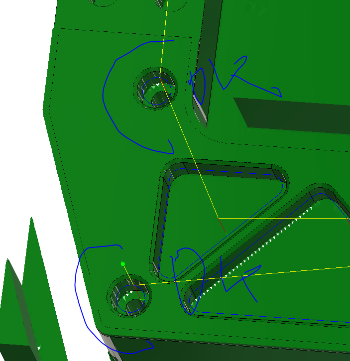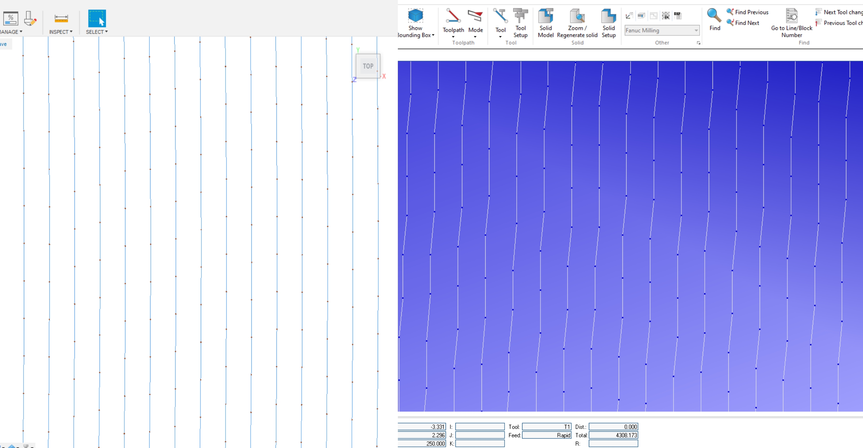 вид сверху везде, без перспективы...да всё дело в том, что строит траекторию хорошо а постпроцессор искажает её..проверял по координатам точек основания , в Фузе все точки на одном уровне а после постпроцессора некоторые на микрон выше или ниже, на изделии получается полоса..на металле сразу видно
