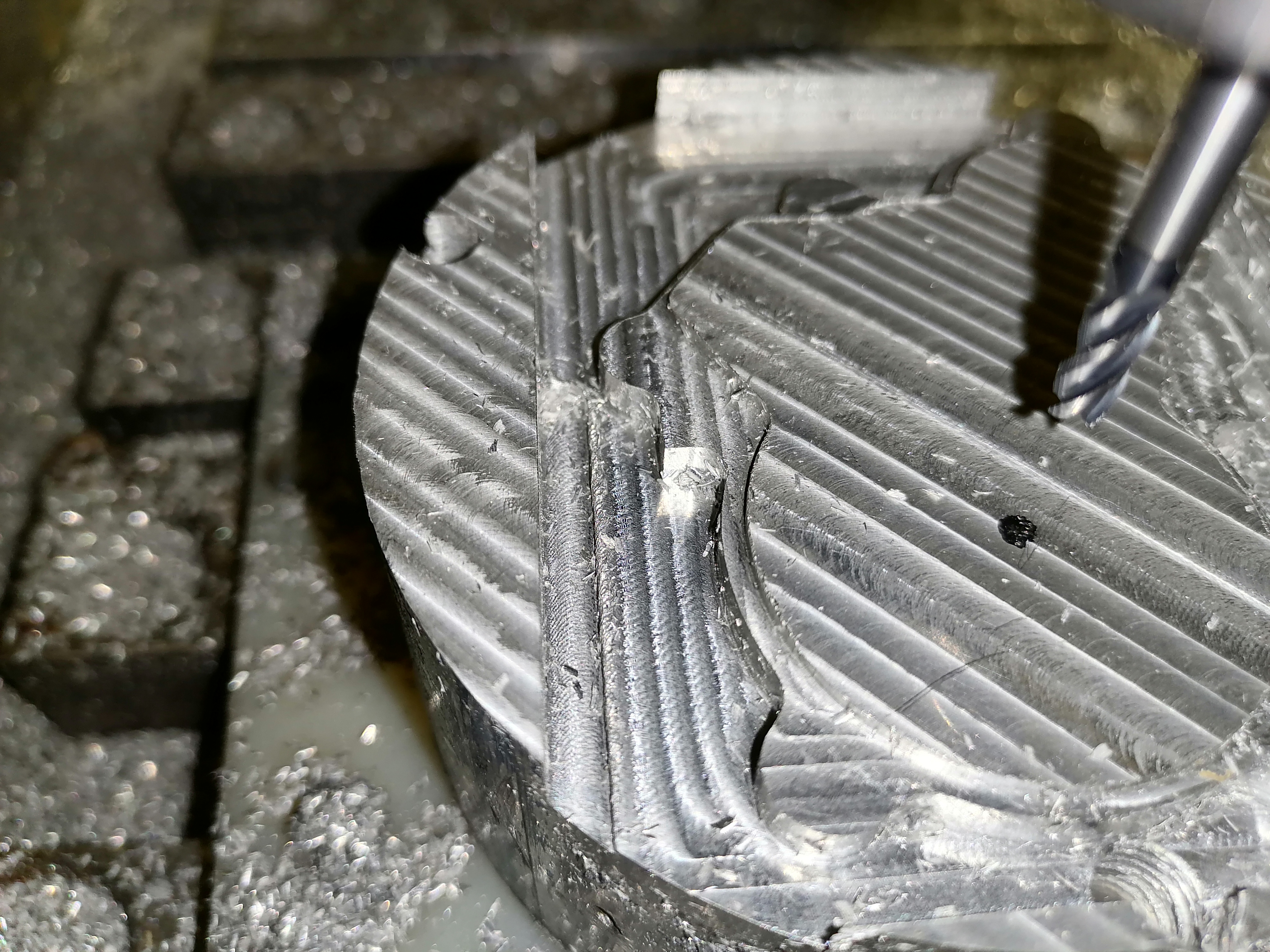 Давно не подходил к станку а тут мне отец подогнал два кругляша болванки как раз в размер детальки :) ну думаю в эти выходные попробую поработать на станке ну не тут то было. Сразу при обдирке фрезой диаметром 10 мм не понравился звук, поменял на шестерку и на пол пути фреза забилась, почистил и продолжил дальше обдирать, дальше взял специально купленную для этого длинную фрезу диаметром 4 мм. и тут понеслось - каждые 2 минуты останавливал станок и чистил фрезу а потом вообще она сломалась оставив последнюю свою борозду (работал с сожем). Вобщем веню во всем материал алюминия который я пытался погрызть :) надо будет гуглить, разбираться что за марка алюминия и какие режимы для него нужны будут.
