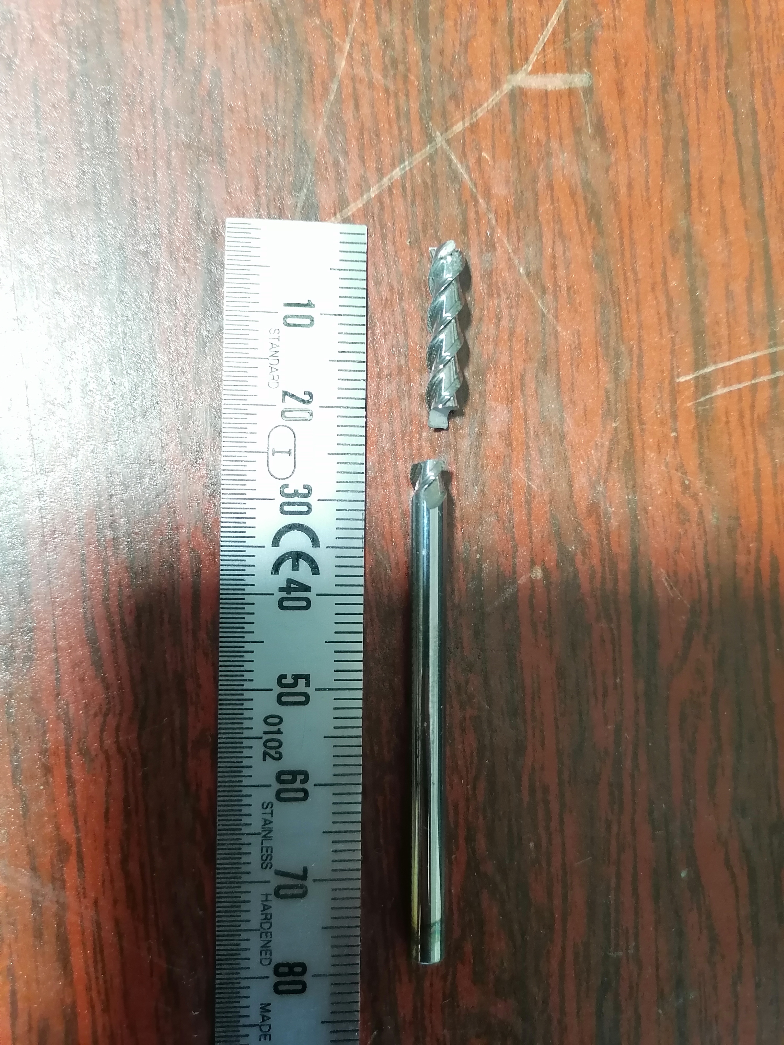 Давно не подходил к станку а тут мне отец подогнал два кругляша болванки как раз в размер детальки :) ну думаю в эти выходные попробую поработать на станке ну не тут то было. Сразу при обдирке фрезой диаметром 10 мм не понравился звук, поменял на шестерку и на пол пути фреза забилась, почистил и продолжил дальше обдирать, дальше взял специально купленную для этого длинную фрезу диаметром 4 мм. и тут понеслось - каждые 2 минуты останавливал станок и чистил фрезу а потом вообще она сломалась оставив последнюю свою борозду (работал с сожем). Вобщем веню во всем материал алюминия который я пытался погрызть :) надо будет гуглить, разбираться что за марка алюминия и какие режимы для него нужны будут.