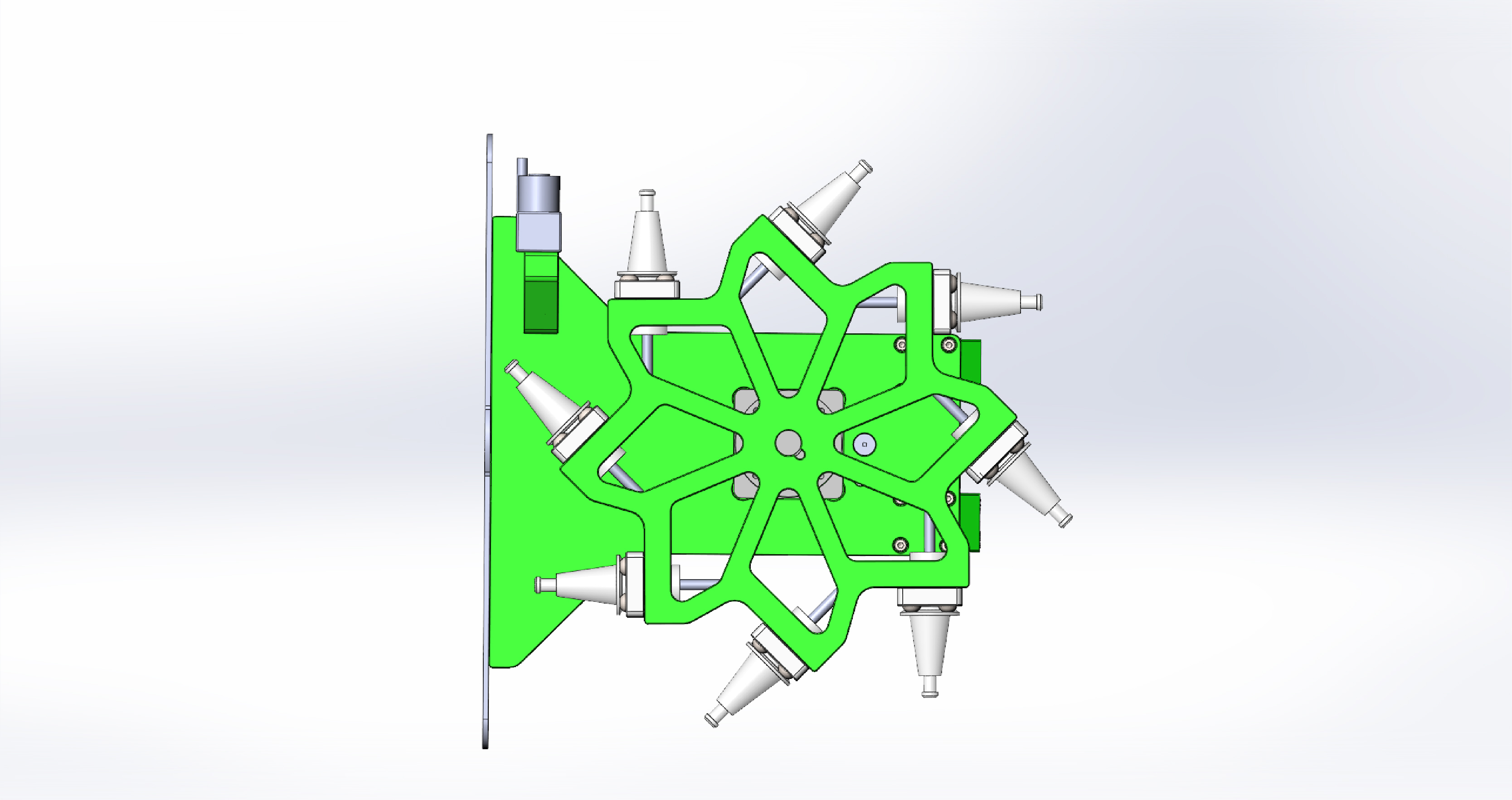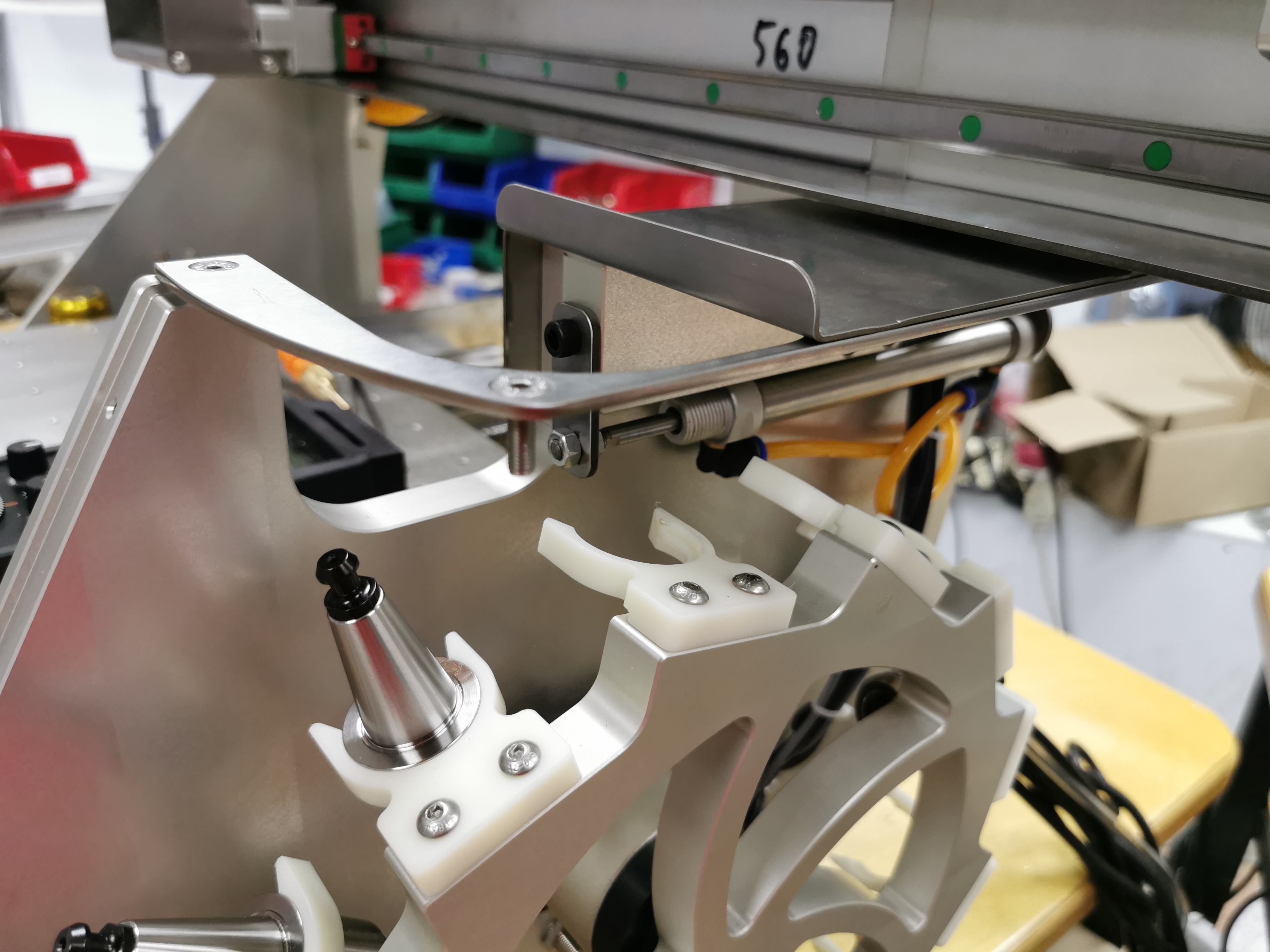 смещенный барабан сюда попал после 5ти осевика где он еще сильней смещен и это решение оказалось очень крутым поскольку решает сразу несколько вопросов. а именно более компактно поскольку смещен больше назад под портал, позволяет впихнуть более длинный инструмент в более мелкий барабан поскольку в первом таком станке длинна инструмента определялась расстоянием от вилки до редуктора а тут ось инструмента не пересекает редуктор потому главный косяк вертикальных барабанов вылечился. ну и просто такой барабан более красивый. можно сказать это теперь еще одно мое оригинальное техническое решение которое пришлось придумать поскольку подсмотреть негде.