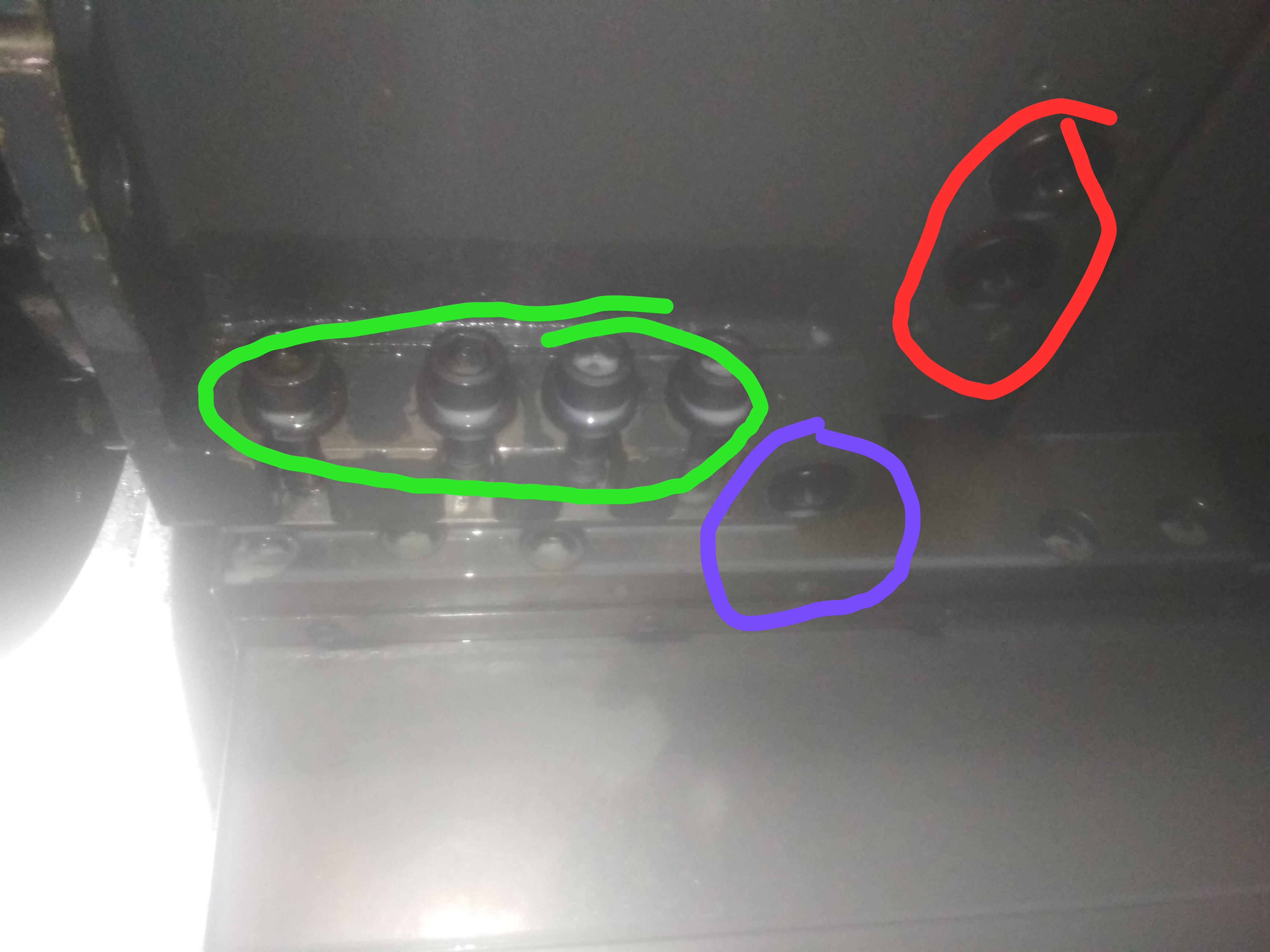Всем здравствуйте, имеется станок DMG MORI СТХ310, револьвер прагати, нужно выставить перпендикулярность РГ. Впринципе все понятно, нужно откуруть болты помеченные зелёным и выставлять револьвер куда надо...но видел как на других ослабив эти болты, вращают ещё какой-то болт для смещения. Вот и хотел узнать есть ли сдесь такое или по старинке молоточком? Вначале думал что это болт который синим обведен, но оказалось он для слива масла))и интересует что за болты обведены красным?