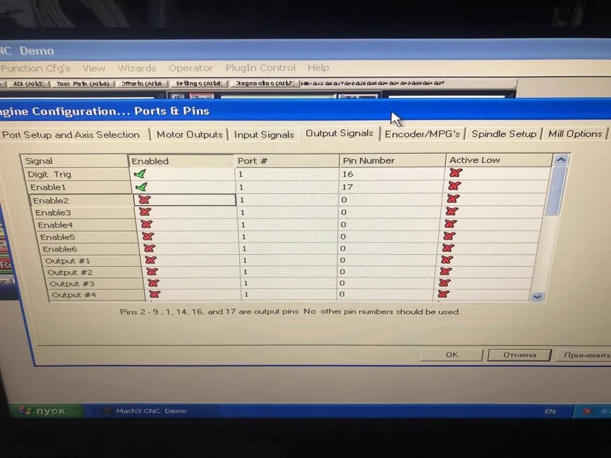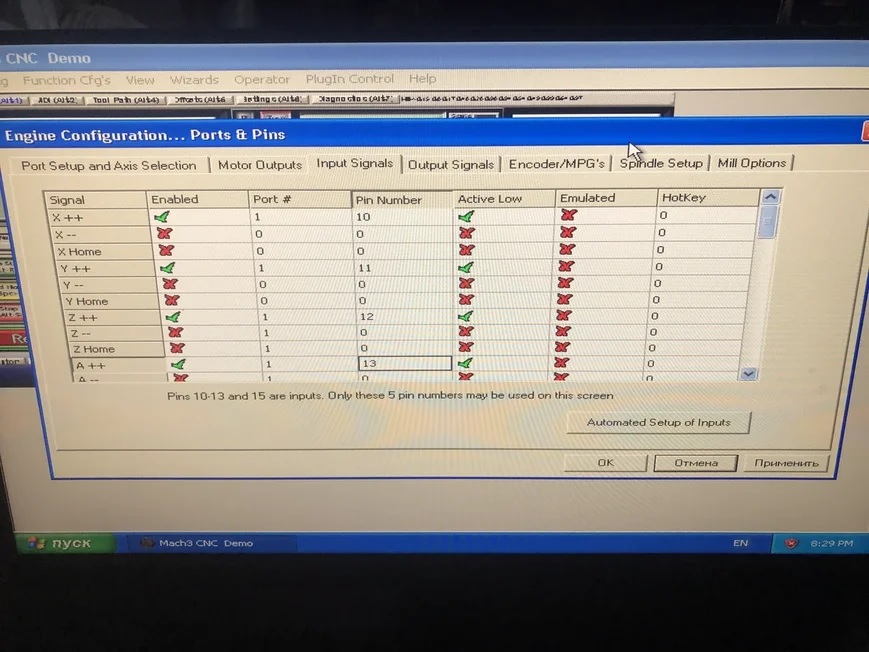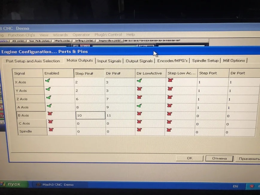 Всем привет, собрал свой первый станок из подручных материалов, получилось достаточно ровная и надежная конструкция, поставил два двигателя на ось У, нужно подчинить ось Y и А, чтобы работали синхронно, а не выходит. Двигал портал через клавиатуру, работает только один двигатель, другой в паре работать не хочет. Отправляю фото настроек mach3, управляющей платы. Почти неделю бьюсь над этим вопросом, подскажите что не так делаю?
