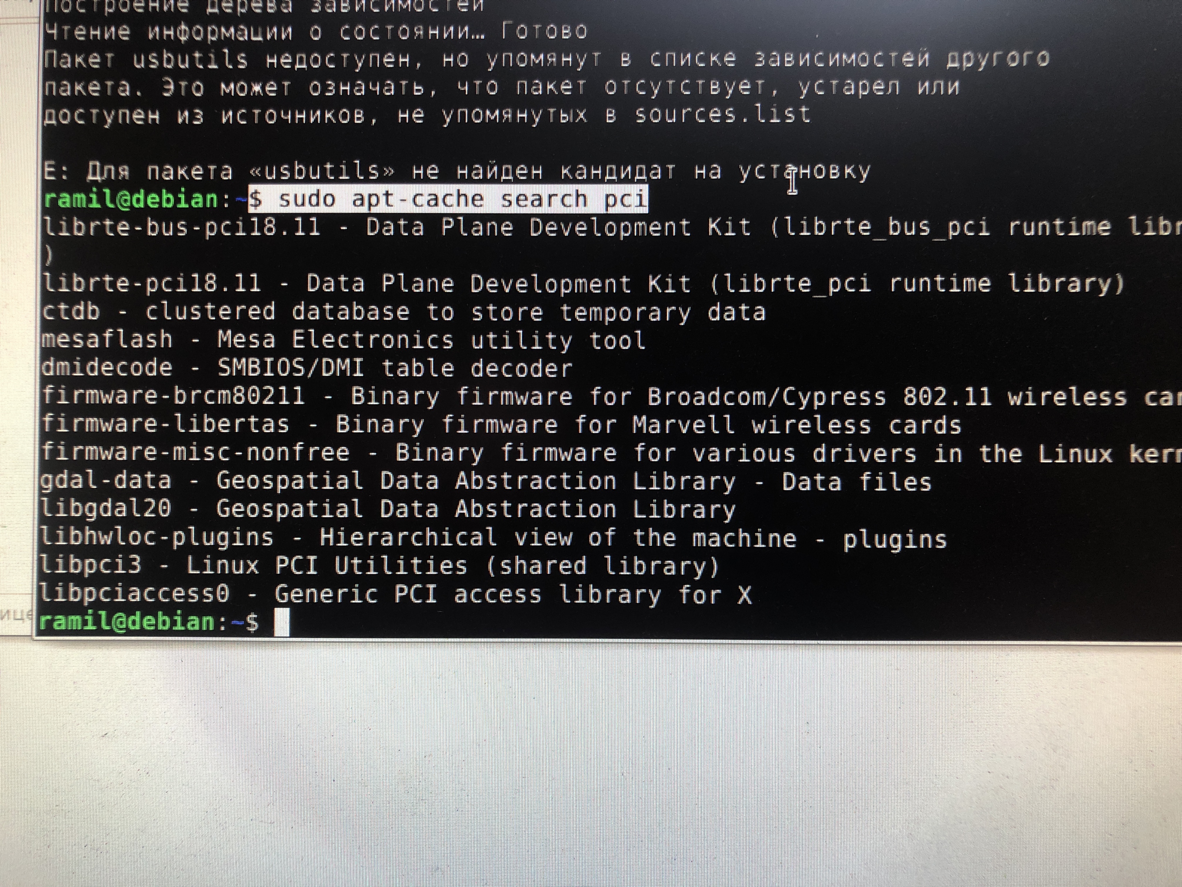 Под этой командой как я понимаю можно посмотреть что есть под этим набором букв, но тут после обновления репозитариев слова pciutils нет