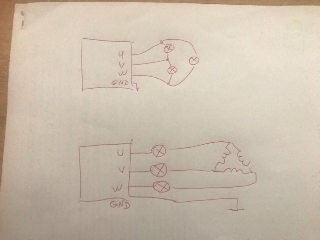Подключил во втором варианте лампы последовательно с обмотками. RUN - лампы не горят, шпиндель не крутится, увеличение крутилкой не помогает, но и Err4 не выдаётся. Напряжение GND-U или GND-V или GND-W одинаковое, равно ~110 вольт.