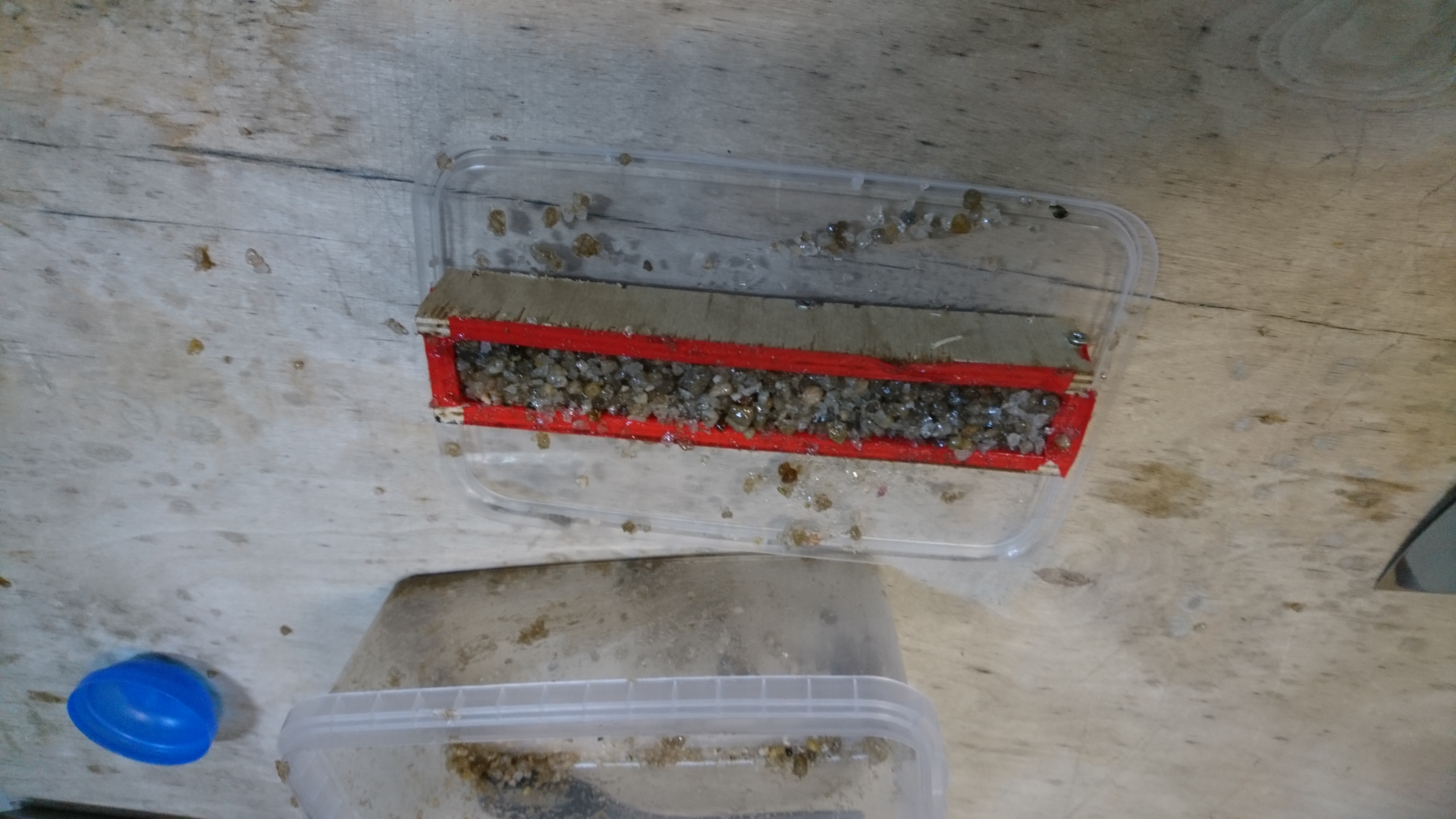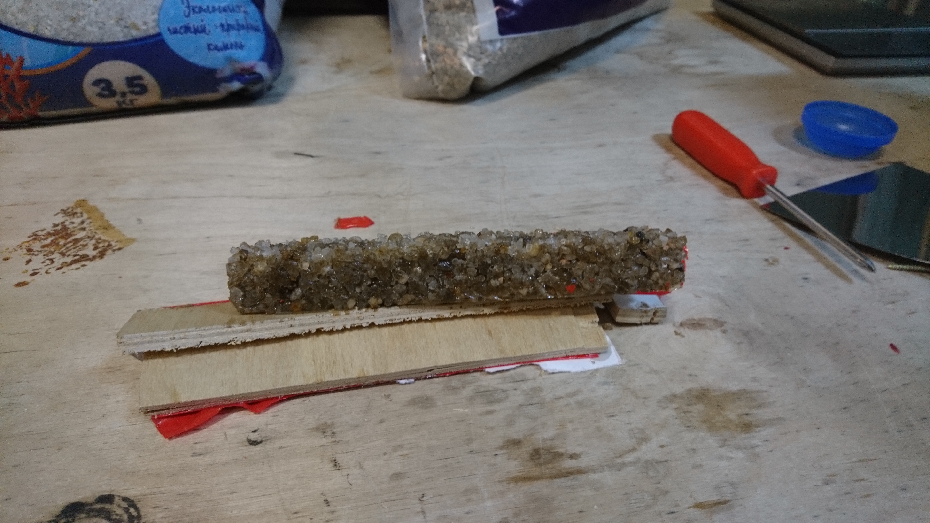 При запрессовке в форму смесь была очень подвижна, в результате чего добиться отсутствия видимых пор не удалось (см. фото). Создаётся ощущение, что в указанной в первом посте ссылке неидеально подобраны пропорции компонентов, либо же это моя недоработка. Тем не менее результат оказался неплохой (относительно, так как уже думал, что вообще не получится).
