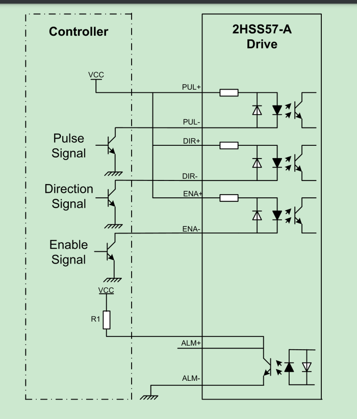 Пробовал все варианты, разницы нет. Буду пробовать по схеме с общим плюсом, но не верю что дифф схема не воспринимается драйвером. Что то не так делаю просто. У меня шаговики на станке по дифф схеме работают, а тут серва и выкаблучивается)
