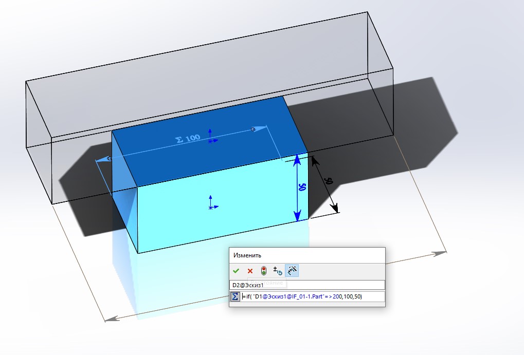 = IIF ( "D1@Эскиз1" = > 200 , 100 , 50 )