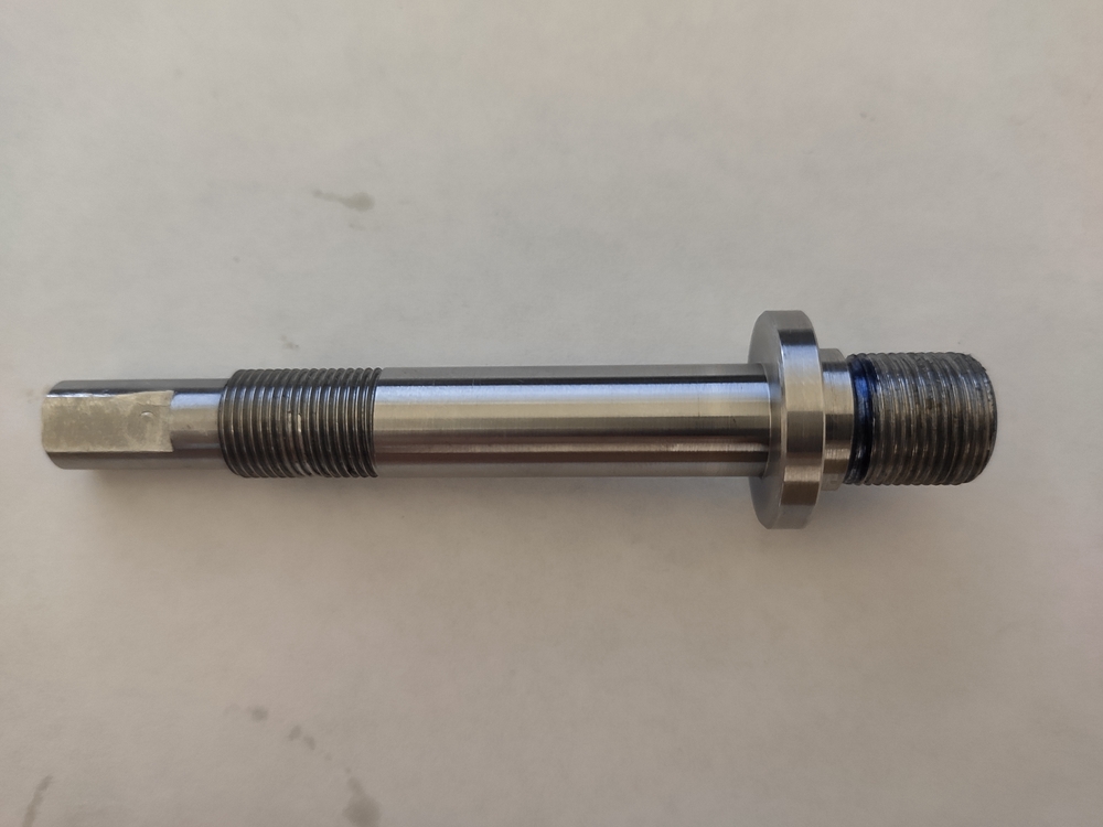 Дальше необходимо поработать над резьбой на валу. Сначала покрасил торец и конец резьбы маркером для досок, вкрутил в патрон и немного поерзал. Увидев, где был контакт, начал снимать. Токарника нет, поэтому вал зажал в шуруповерт, выставил передачу с большой скоростью, взял маленький надфиль и начал снимать то с торца, то с задней части у шайбы. Не уверен, что у шайбы нужно было что-то снимать, у меня там был контакт пару раз, и то не очень явный, но на всякий случай занизил конец резьбы у шайбы. В основном делал фаску на торце, пока не получил нормальное прилегание патрона к шайбе. На все про все ушло минут 20, с токарником хватило бы минуты.