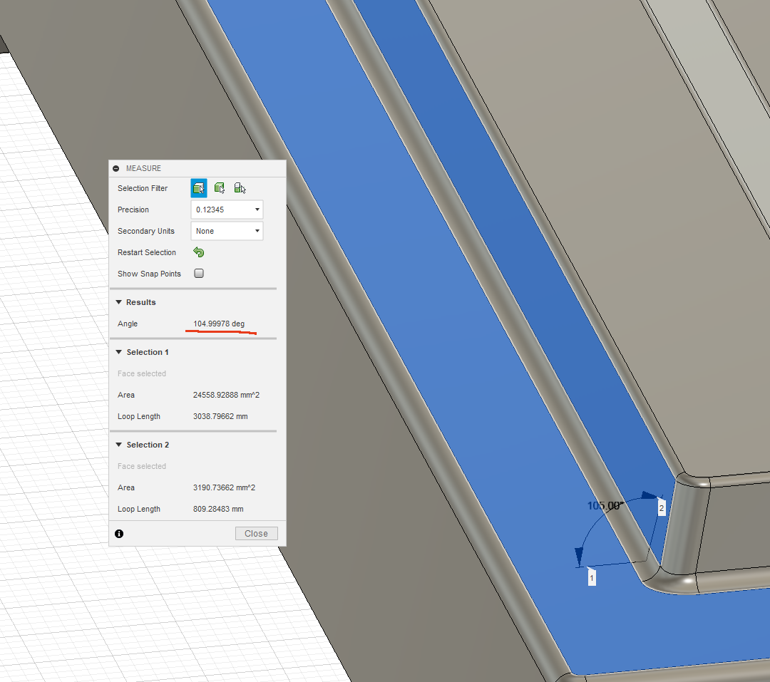 Пример: 2 плоские грани под определенным углом. В разных точках измеряются разные углы. Как видите, происходит ошибка после третьего знака после запятой. Деталь спроектирована в F360, т.е. не импортирована, чем теоретически можно объяснить ошибку.