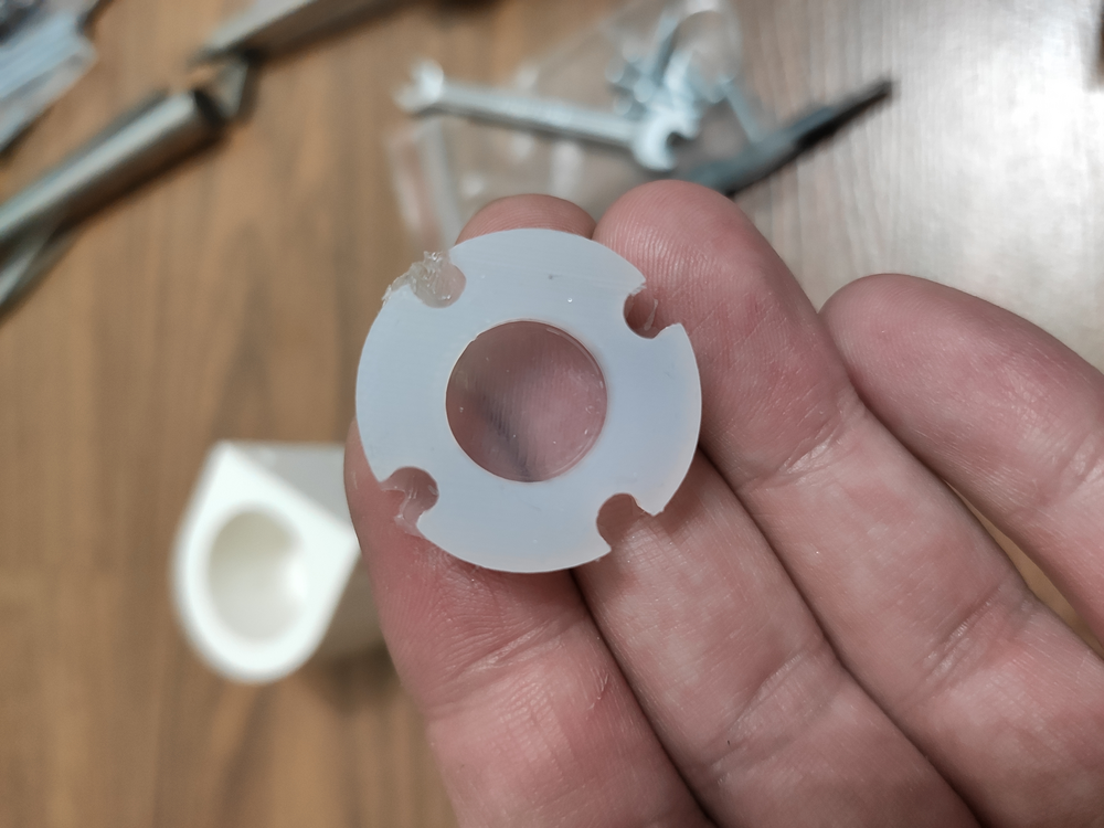 В одном самосборе использовал схему с двумя гайками, но для простоты регулировки отлил из достаточно твердого силикона шайбу, которую стягивал между двумя гайками винтами и гайками М3 через 2 противоположных отверстия, а через другие 2 крепил в оправу, при этом нужно контролировать расстояние между шайбами в местах стяжки штангенциркулем, чтобы не перекосило. Шайба тут выступала не как пружина (поскольку она слишком жесткая и клинит винт), а как распорка для жесткого креплени. При этом стягивал ее достаточно сильно (примерно в 2 раза от первоначальной толщины), чтобы не пружинила. С ней немного проще, чем просто на винтах и гайках. По замерам для дальшейшей ее деформации нужно 35-40 кгс