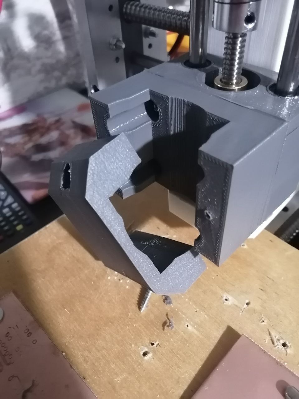 А зачем ты напечатал квадратную посадку под круглый шпиндель? Судя по щели в районе винта у тебя шпиндель с гнутым валом будет "самоцентрироваться" вокруг неподвижной точки в текстолите, там где гравер воткнется... Напечатай хотя бы так: http://leddrv.eu/image/catalog/blog/3018/image037.jpg , но под 2 винта с одной стороны...