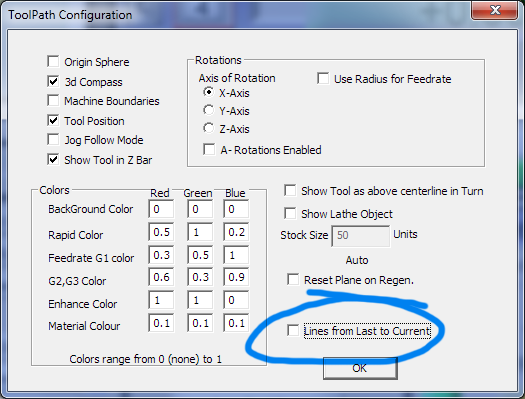 Если убрать галочку в меню Config/ToolPath/ то положение инструмента будет отображаться редкими точками, но, за то, с реальными координатами.