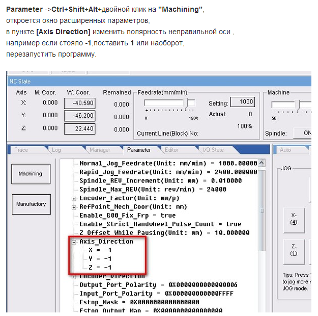 Добрый день ,прошу помощи с настройкой направления поиска "Дома". пришла плата ncstudio работает с софтом v5.5.60 (только при ошибках почему то кракозябры пишутся) Поставил направления перемещения в соответствии с рабочей зоной. как и в Mach3 была. но концевики расположенны по Y в другой стороне. т.к. удобно чтоб станок отьезжал назад не мешая при обнулении. с настройкой мача проблем не возникло. Тут же не могу сообщить NCSTUDIO, что дом находится не в точке (X0,Y0,Z0) а в точке (X0,Y380,Z130).