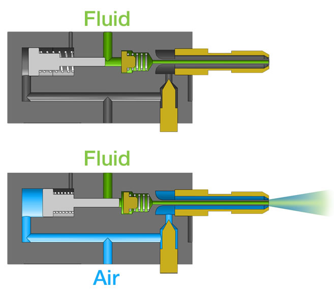 Там один плунжер который приводится в действие воздухом, который открывается соленоидом по таймеру. Соленоид стрекочет как кузнечик. Получаются мелкие импульсы. То есть толкает жижу именно плунжер, у которого ход регулируется.