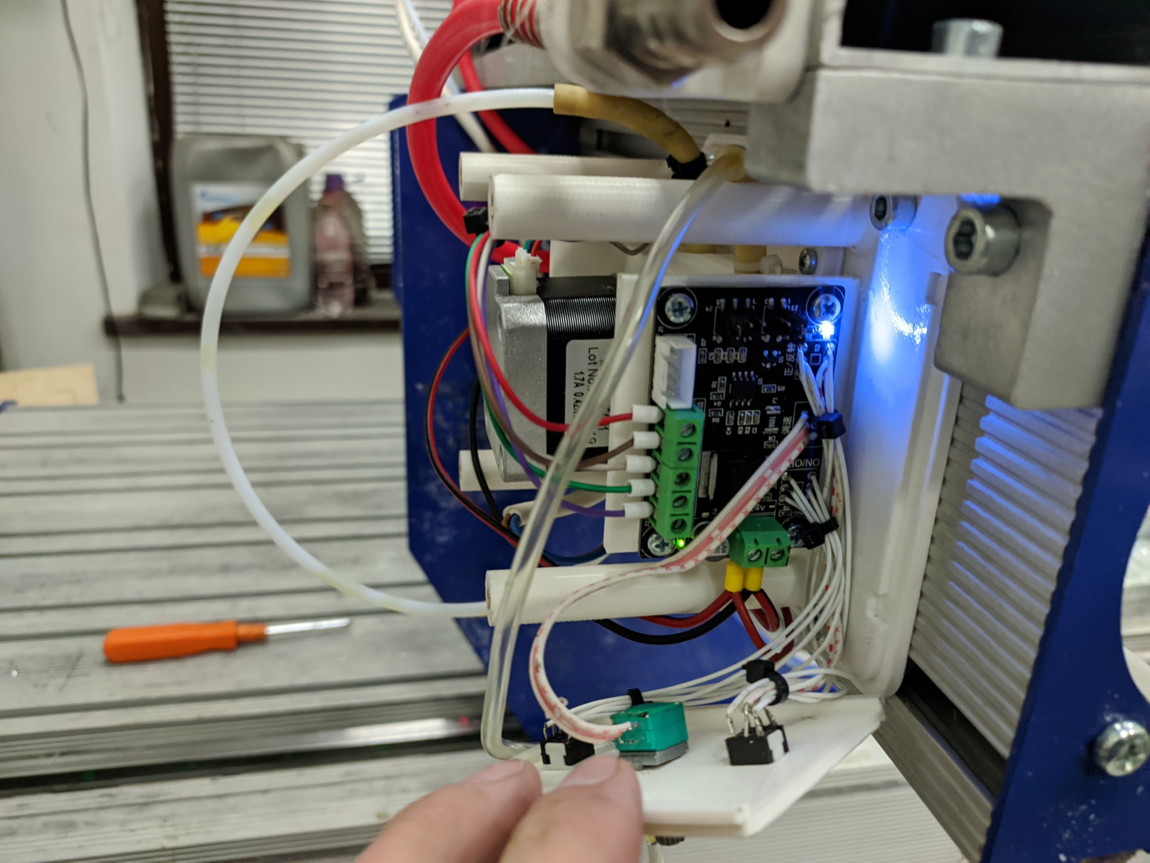 К вопросу о СОЖ, сделал себе на 3д принтере такой насос. Есть кнопка включения, реверс и регулировка оборотов. Насос сделал перистальтический, Небольшая пульсация конечно есть, но мне не критично, к тому же можно сделать не четыре ролика, а например шесть. Что удобно, нет никакой ардуины для управления шаговиком. Вся электроника куплена на али, цена не более 400 рублей, мотор нема 17 был в запасах