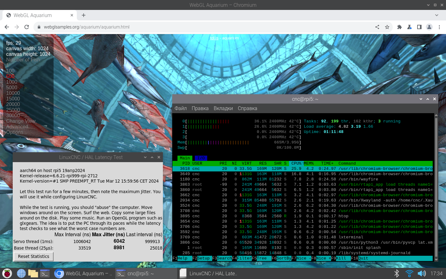 Очевидно, что надо брать за основу сборку официальную и дальше от неё плясать. Хотел я ядро с RT патчем собрать, но меня опередил человек с форума лцнц. Ему, кстати, отдельное спасибо. Он даже инструкцию написал и все файлы выложил. По его стопам я накатил RT ядро нужной версии и пакеты лцнц версии 2.9.2. Ещё один штрих - настройки в командной строке запуска для изоляции двух последних ядер процессора. И вуаля, практически всё работает. Всякие AXIS, gmocappy робят на Ура. А вот интерфейсы на основе qtvcp - не запускаются по причине Segmentation Fault от связки Python3 + QT5. Возможно, там какие-то пакеты Python3+QT5 из малиновой репы собраны без совместимости с малиновым видеодрайвером. Или ещё какие-то глубинные настройки нужны. Или вовсе - многочасовая пересборка каких-то Python3+QT5 пакетов с нужными параметрами, что, в общем-то, дичь. Не зря же в сборке на сайте лцнц видеодрайвер не работает. Финальной вишенкой на торте может быть только фиксация частоты процессора на каком-то одном значении. Допустим - 1,8Ггц, чтобы сильно малину не перегреть. Из опытов с Orange Pi помню, что сделать это несложно, но до этого руки ещё не дошли. Пока всё робит как есть, частота проца прыгает от 1,5 до 2,4 ГГц.