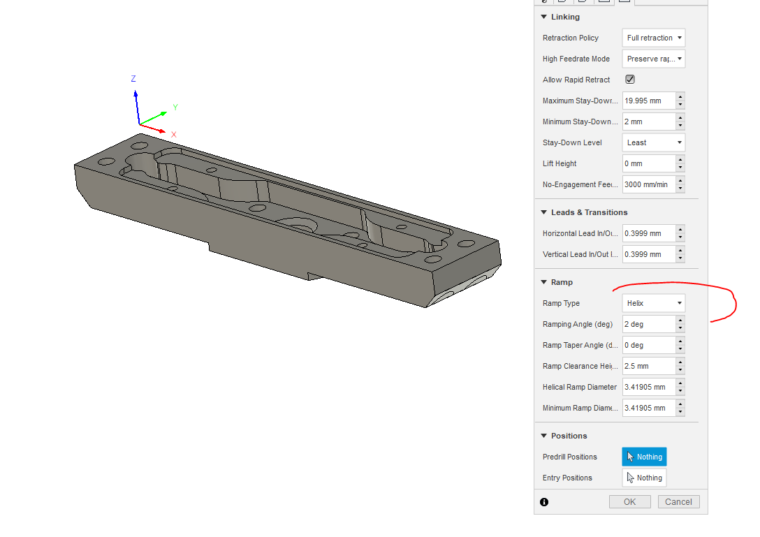 вот для примера - тут Два разных типа захода в Один карман. Там где я ему сказал что открыто - он входит снаружи. Где не может этого сделать - генерирует спираль, как и указано в настройках. Закрыть контур полностью можно всегда - будет две спирали.