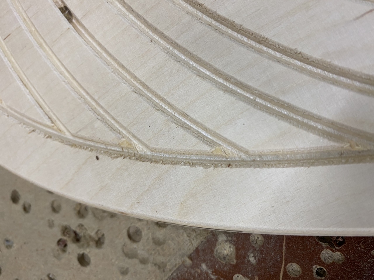 Режу берёзовую фанеру v-пазовой фрезой 90 градусов, обороты 24000, подача 4м/мин. Не могу решить проблему образования задиров в местах, где фреза идёт под 45 градусов напротив волокон дерева. Уменьшение подачи результата не даёт, в жёсткости станка тоже нет повода сомневаться, фанеру перепробовал самых разных производителей. Фрезы пробовал CMT и DJTOOL. Фото прилагаю.