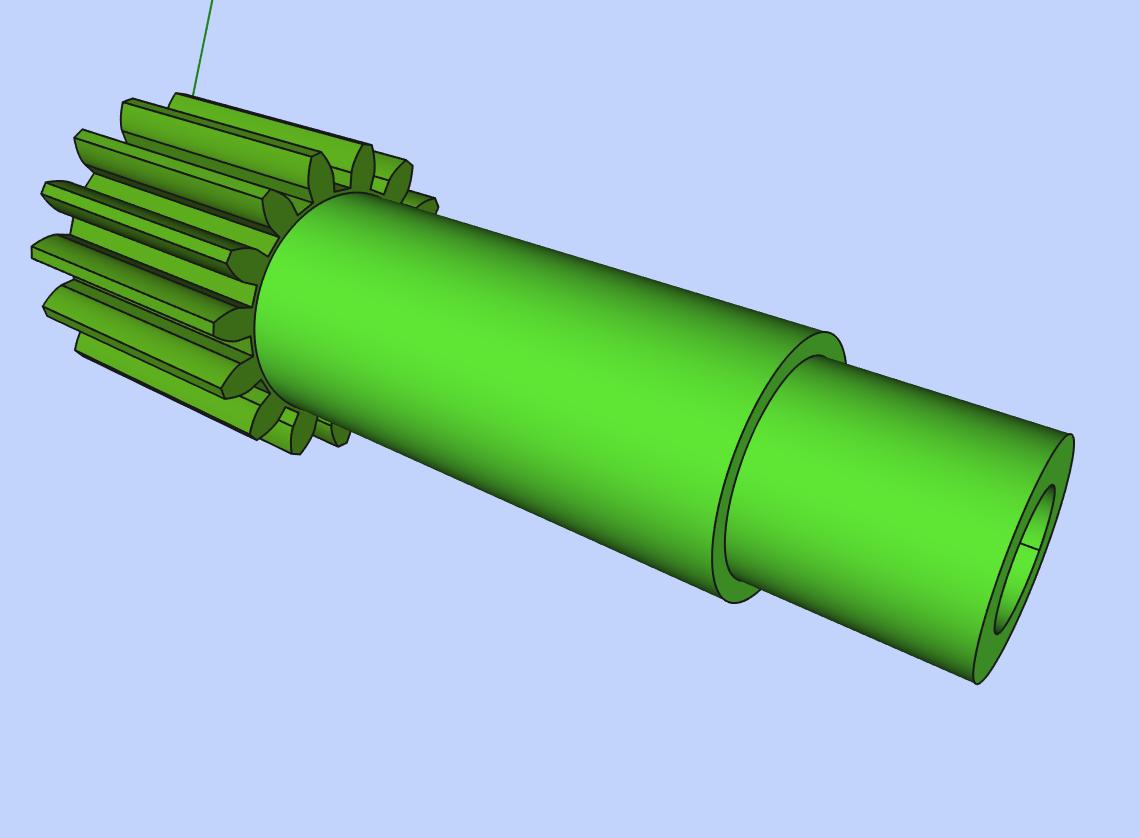 Это шестерня, идущая по рейке, соответственно М1 и 15-17 зубьев. Диаметры очевидны - исходя из таблиц стандартных шестерней диаметр вала-ступицы 12мм большая шестерня без ступицы от 60 до 127 зубьев, для 17 зубьев подшипник на 15, для 15 зубьев подшипник на 12 (или всегда на 12). Одна деталь на все случаи жизни. Длину следует делать с запасом - лишнее отрезать ножовкой может каждый. Еще на конце можно нарезать резьбу - для облегчения посадки подшипников и большой шестерни.
