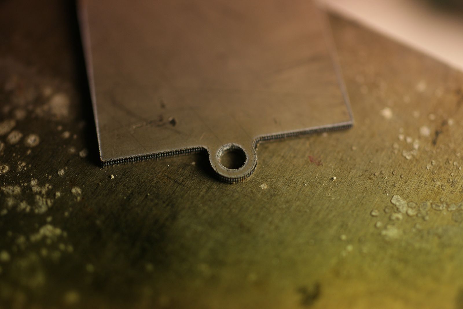 Качество отреза. Титан 1мм, резка воблингом до отлома. Деталь 40*30мм - около 90мин. Лазер МАХ-30Вт.